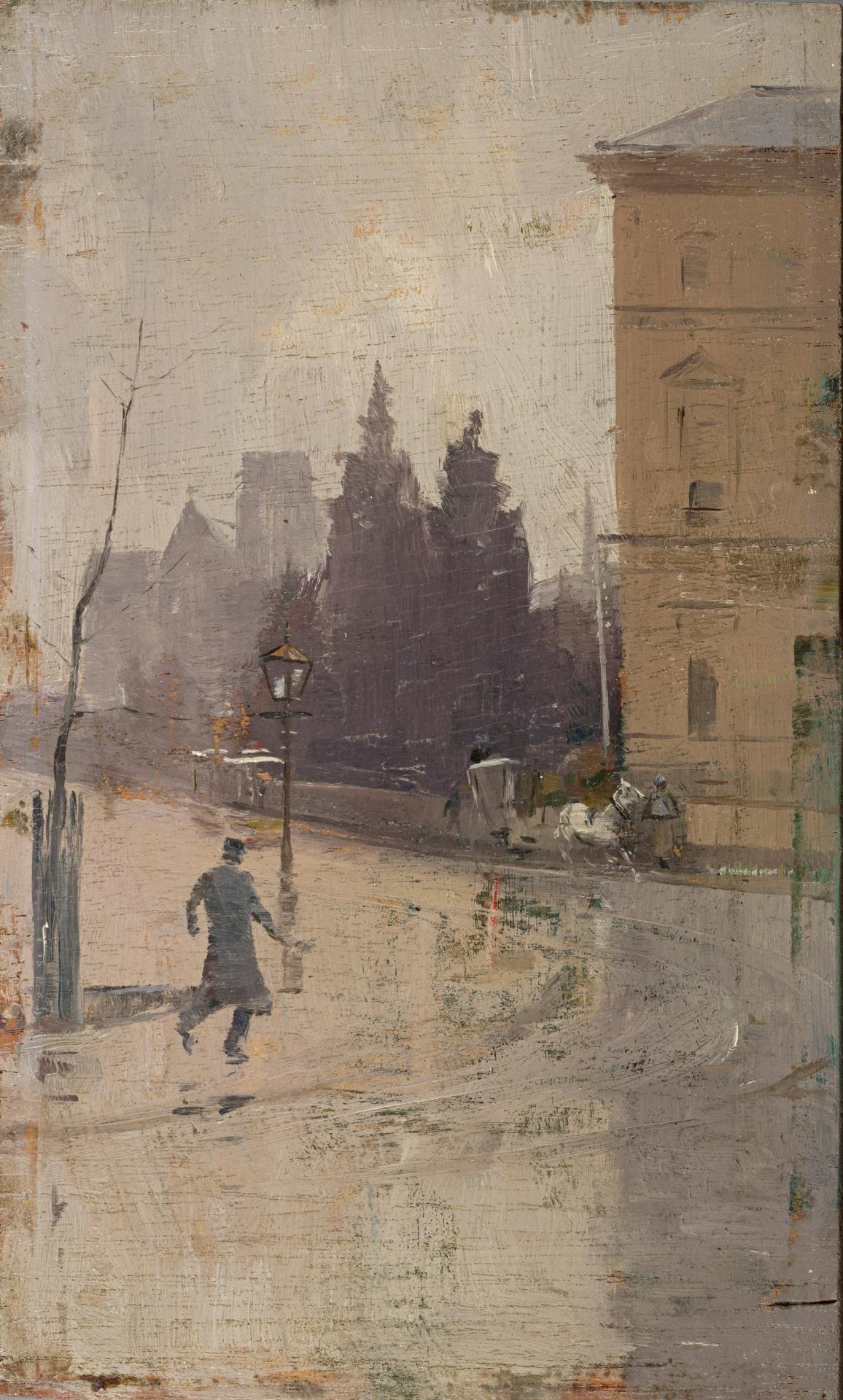By the Treasury was painted outside Grosvenor Chambers, 9 Collins Street, Melbourne, and shows the corner of Spring and Collins streets on a wet winter’s day. The driver of a hansom cab, in caped overcoat, restrains his horse near the corner of the Treasury; a cable car rattles down Macarthur Street from Saint Patrick’s Cathedral (its spires still unbuilt); and a pedestrian, in top hat and overcoat, crosses Spring Street in the foreground. The panel (a cedar cigar-box lid, still retaining its original Favorita label) is ‘dashed off’, brilliantly utilising the grain of the wood to suggest the texture of the sky, buildings and road. The subdued and tonal palette shares similarities with works by the famous American painter James McNeill Whistler.