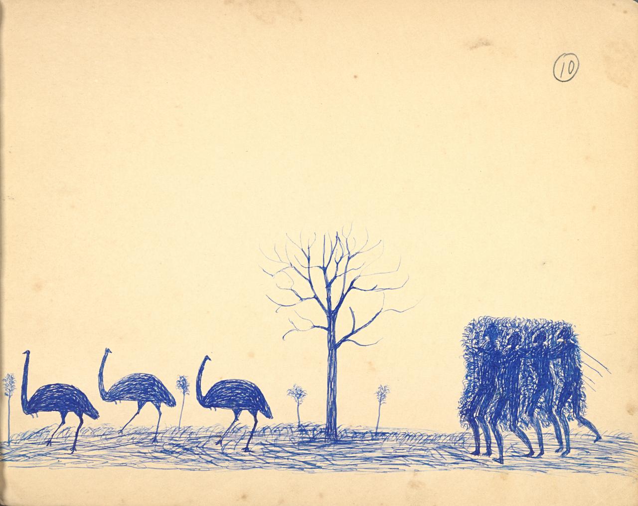 The variety of subject matter recorded by McRae is displayed within the pages of both the Notebook and the Sketchbook. The Sketchbook, executed later, is memorable for its depictions of Aboriginal people hunting, fishing, warring and performing ceremonies. Four hunters, disguised as bushes, stalk emus, while two hunters surround a tree full of birds (fig.3). The fishing, fighting and hunting vignettes are casual records of the moment in contrast to the detailed depiction of a full corroboree (fig. 2) in which all the performers bear different clan designs and are decorated with feather headdresses and leggings. In this, as in other drawings, the sparseness of the style allows the paper to suggest space. The landscape setting is indicated with singular brevity: the ground is loosely marked by a tangle of lines, a single, skeletal eucalypt is suggestive of the bush.