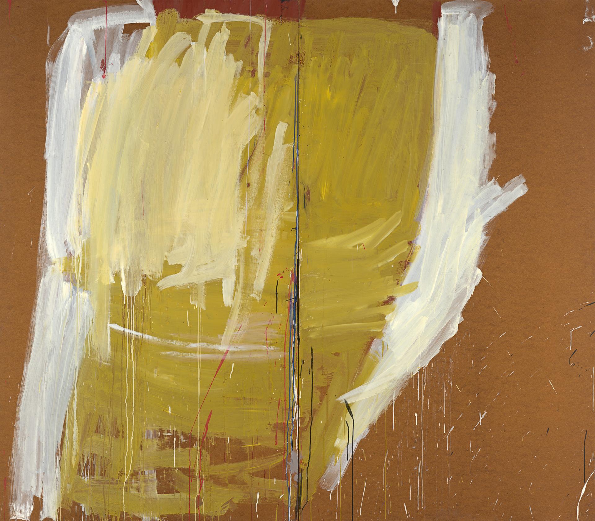 At their very core Tuckson’s late paintings are, put simply, paintings about painting. Minimal titles such as Untitled – yellow focus attention on the raw materiality of these works and their tactility is heightened by the masonite support which, unprimed, was already warped by the time of the 1973 exhibition. The scale of the panels Tuckson used in this painting demanded an intensely physical way of working and the broad brushstrokes of white paint over yellow, with splashes, smudges and dribbles of red, black, blue and grey speak of the frenetic energy of its creation.