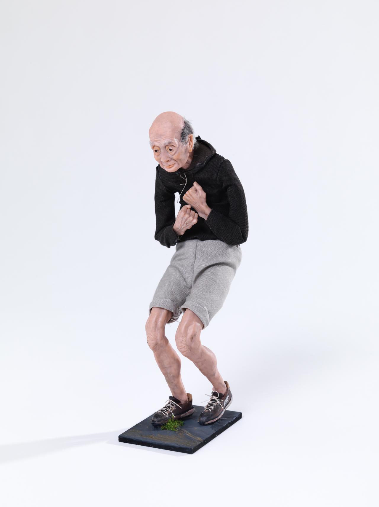 Grace Stevenson’s Fast forward, 2019, shows a young girl using a remote control to ‘accelerate’ into adult life. Stevenson’s painting and folio represent the desires of the young and old to switch ages. Also reflecting on the ageing body, Lucy Randall depicts eighty-seven-year-old Mr Tak Wong’s daily routine of an afternoon run to keep fit and agile in Randall’s local neighbourhood of Hampton. The shuffler, 2019, reflects the resilience of this local identity.