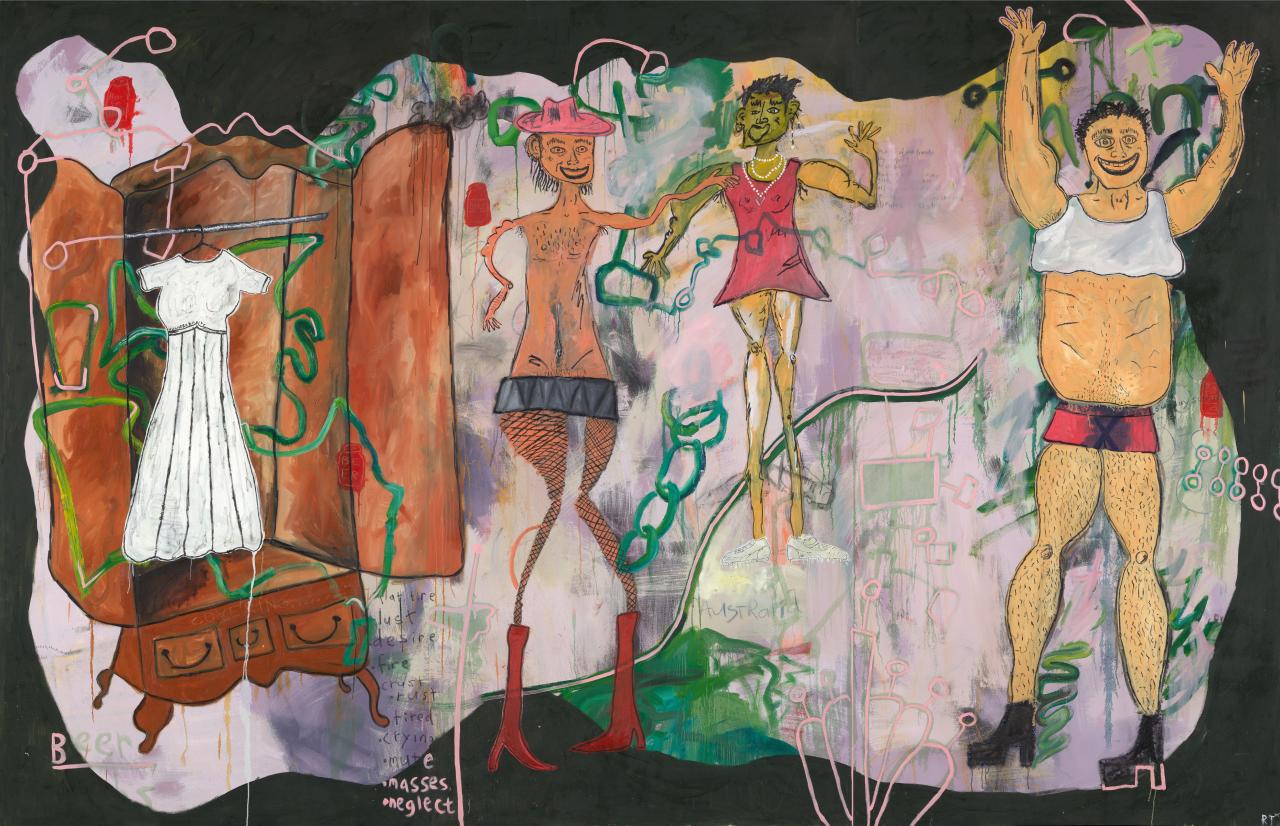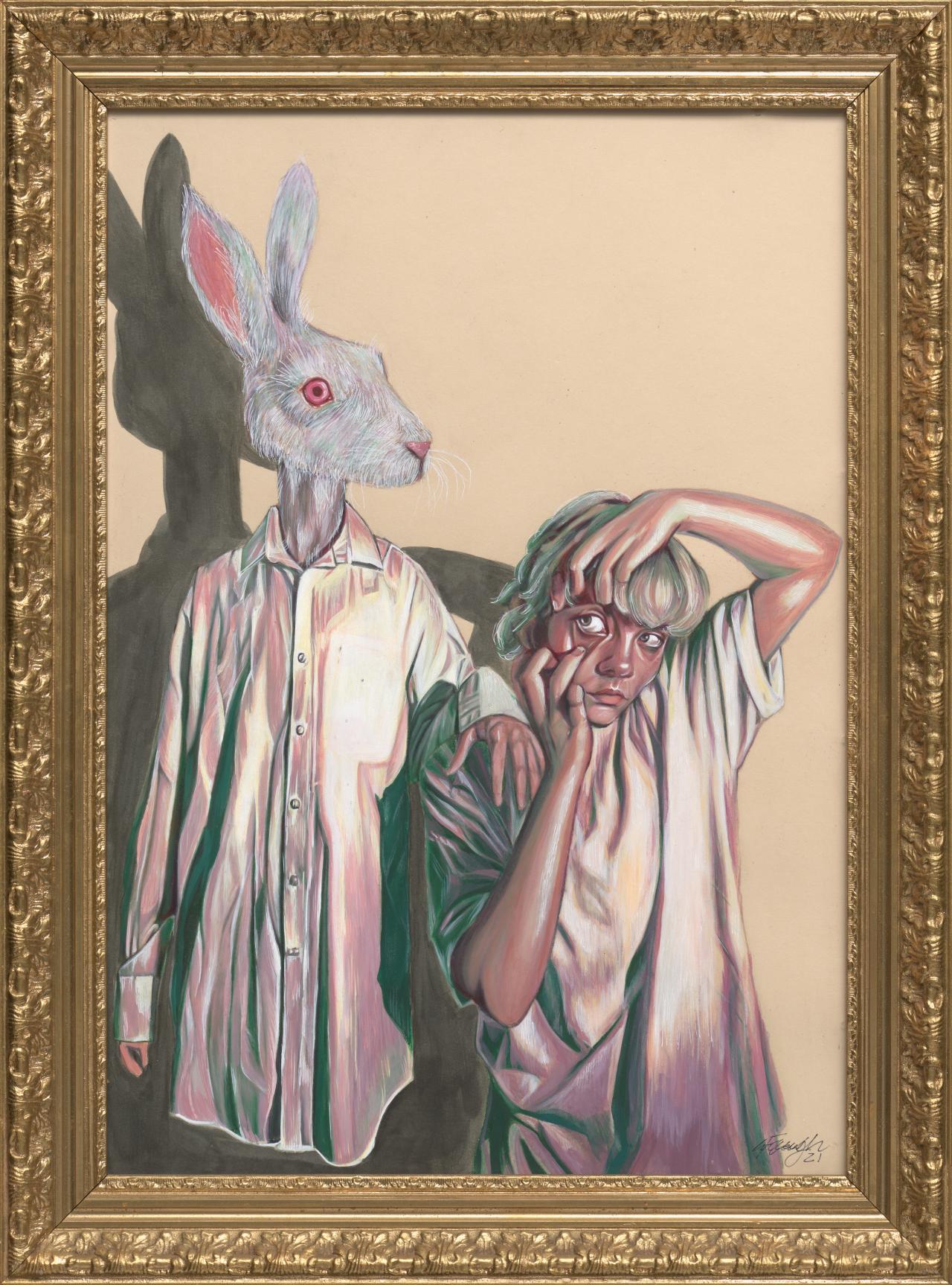 Arthur Foulkes’s giant triptych A party in the closet, for example, addresses gender stereotypes, calling out toxic male behaviours. Jordyn Bower vividly portrays feelings of drowning and suffocation in her work Unattainable series, while Lucy Franich’s An attempt at self analysis and Can’t catch me depict her struggles with ADHD, shown in the form of a rabbit, and the difficulty of escaping other people’s preconceptions.