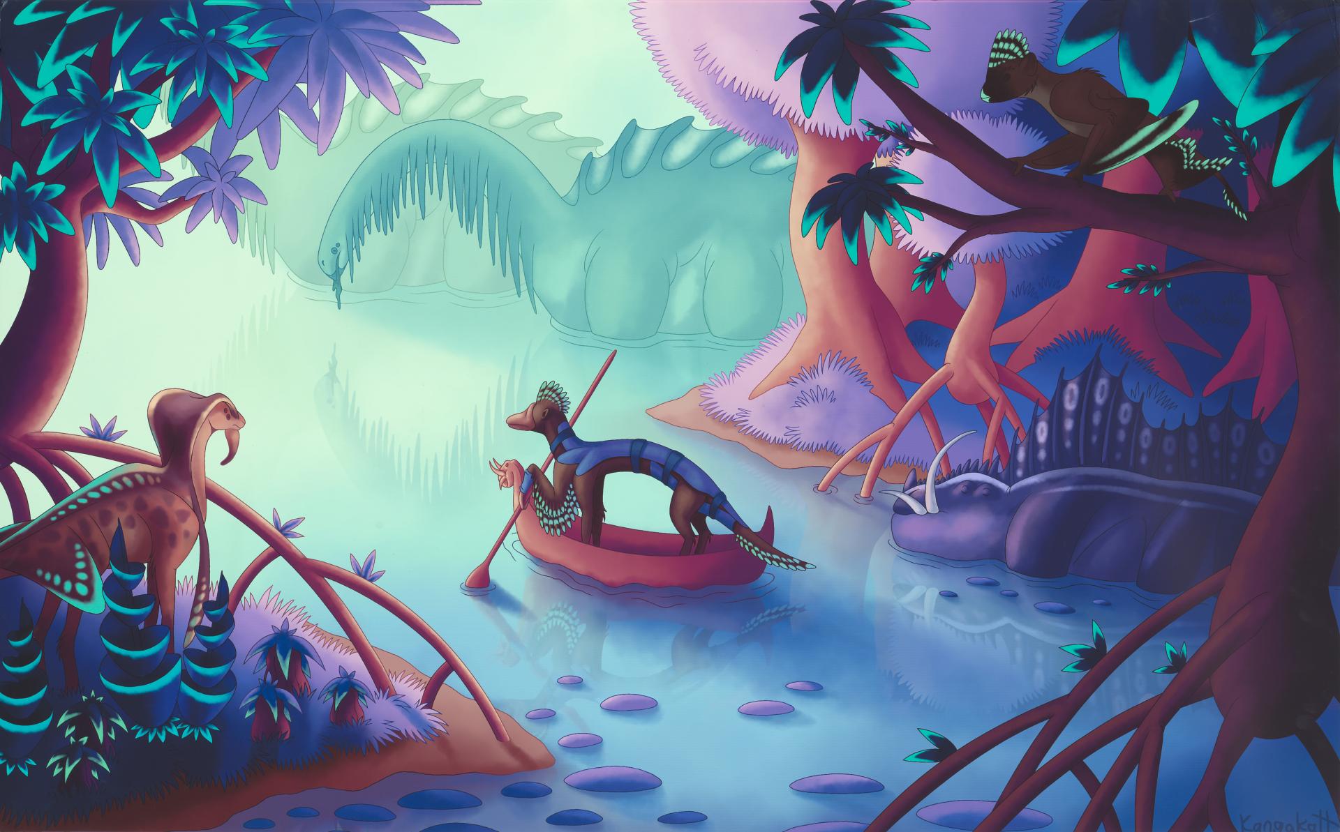 Clare Platt transports us to a landscape on another world in Green and purple alien swamp. Thick jungle and mangroves are part of an ecosystem of carefully considered life forms.