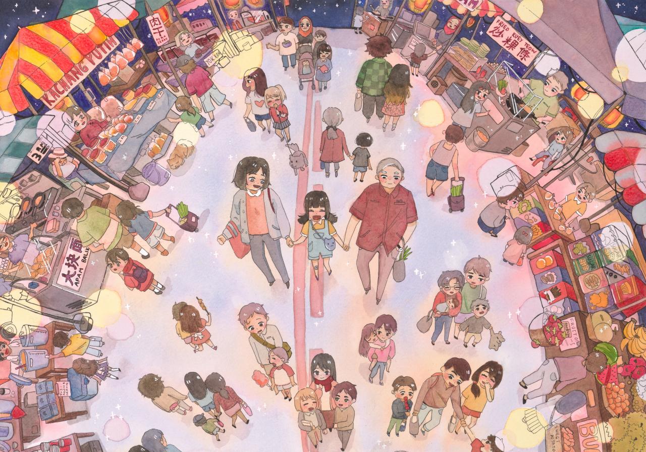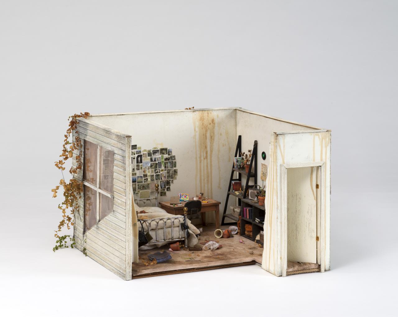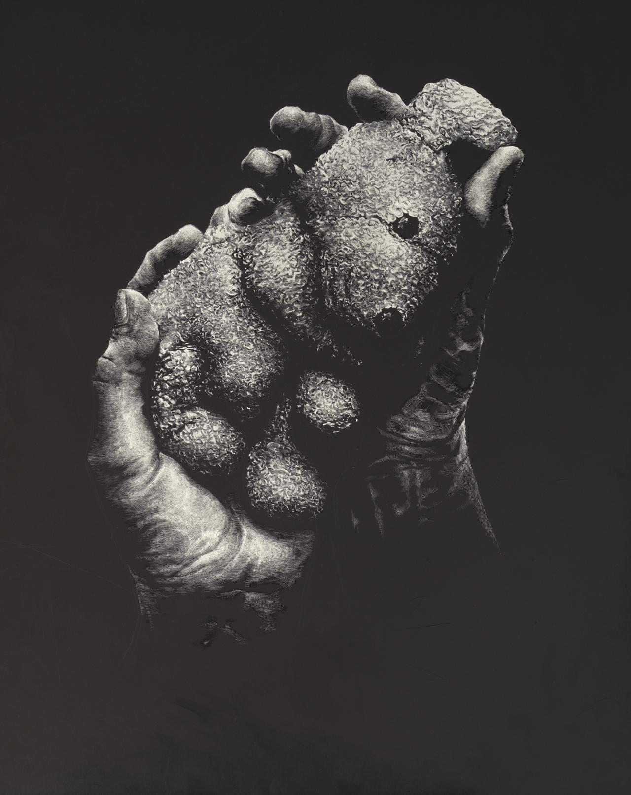 In Exploring the night market, Jane Siew fondly remembers a childhood growing up in Malaysia. Eve Selsick’s Departure of childhood and Morgandy Walker’s Adulthood’s remorse both confront feelings about growing up and change: Selsick recreates her bedroom in miniature, abandoned; and Walker evokes nostalgia for times past in her detailed rendering of weathered hands cradling a worn teddy bear.