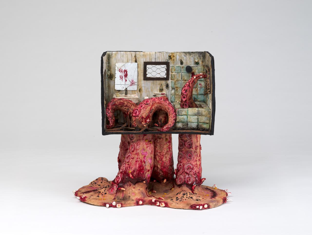 In contrast, for Kellie Palatino home is a horror show. In It’s alive! she stages a wildly imaginative scene of bathroom carnage. Suckered tentacles burst through the filthy bath and floor. Mundane reality is shattered by the intrusion of a monster. The destruction is so complete that a return to normality is out of the question.