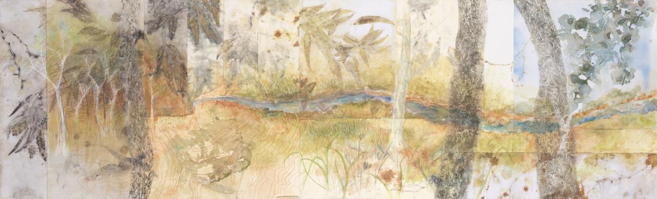 Olivia Watson’s Water’s journey articulates the story of the creek that she visited daily during lockdown. In layers of imagery, coloured with local plant dyes and soil, she builds a record of and connection to the landscape her mother and grandfather also played in as children.
