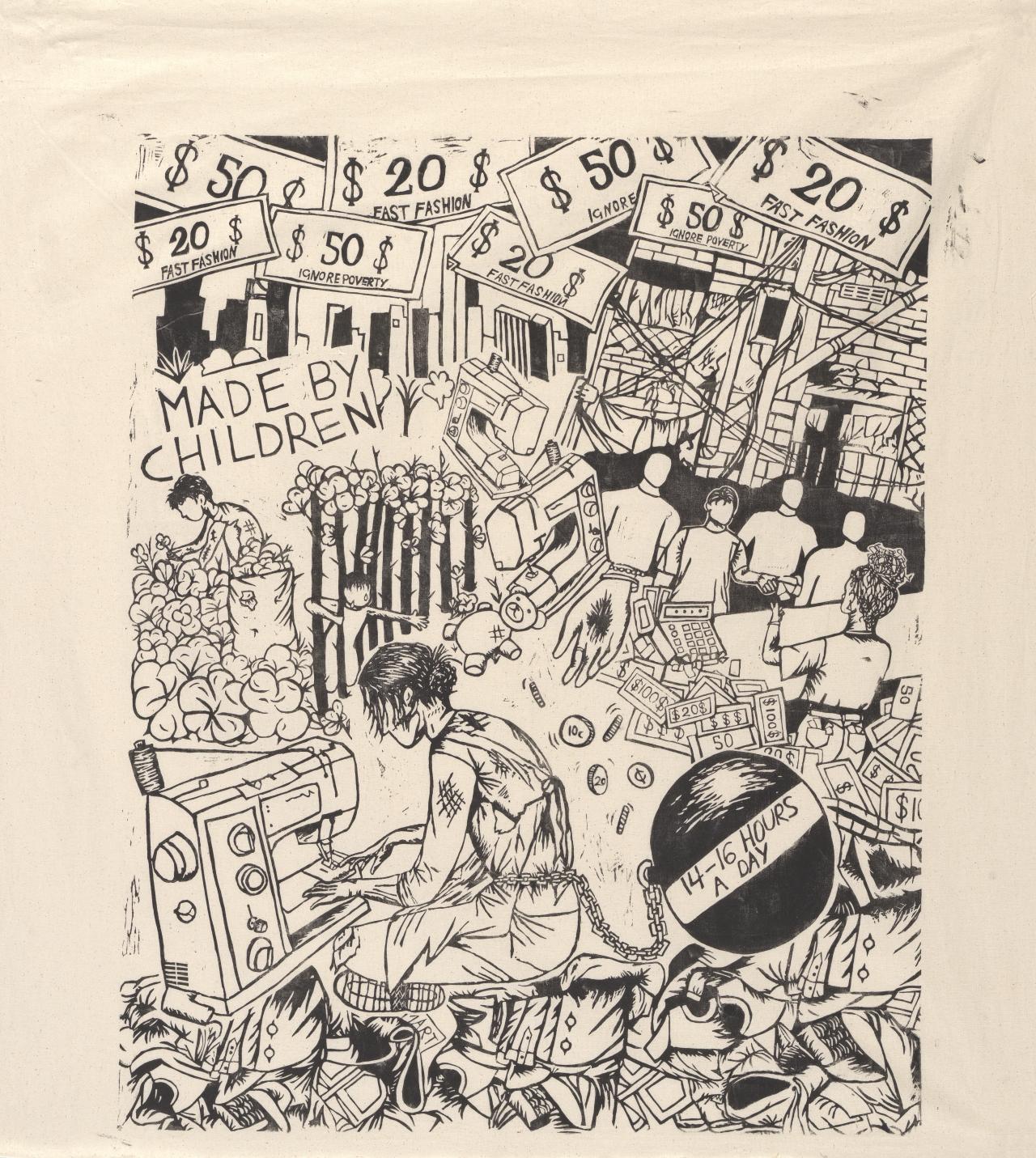 Liana Kelemen’s film work Businessman comments on the corporate world’s pursuit of profit at the expense of people and environment. These sentiments are echoed in Sandra Gibbins’s enormous linoprint Greed, which examines the true cost of our appetite for fast fashion and profit. Further, India Wallace’s installation $12,594.40 addresses the issue of the gender pay gap, with the work’s title referring to the difference in average pay between men and women.