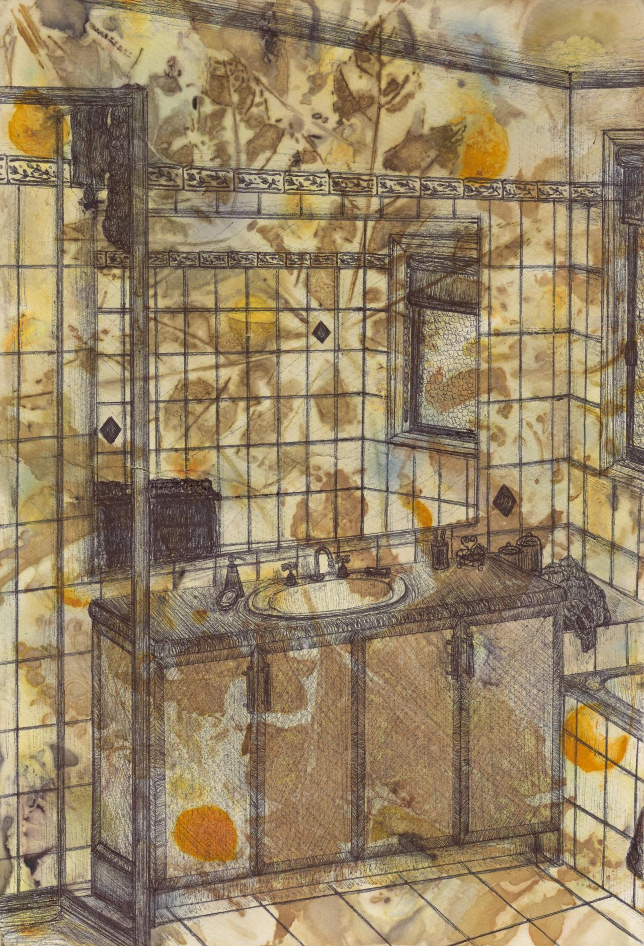 Enforced time at home during lockdowns gave students a different view of their home environment. In Present: Domesticity, Zara Long observes the changes in the rooms of her house as time passes, capturing views and details of the spaces in a series of ballpoint pen drawings on dyed paper.