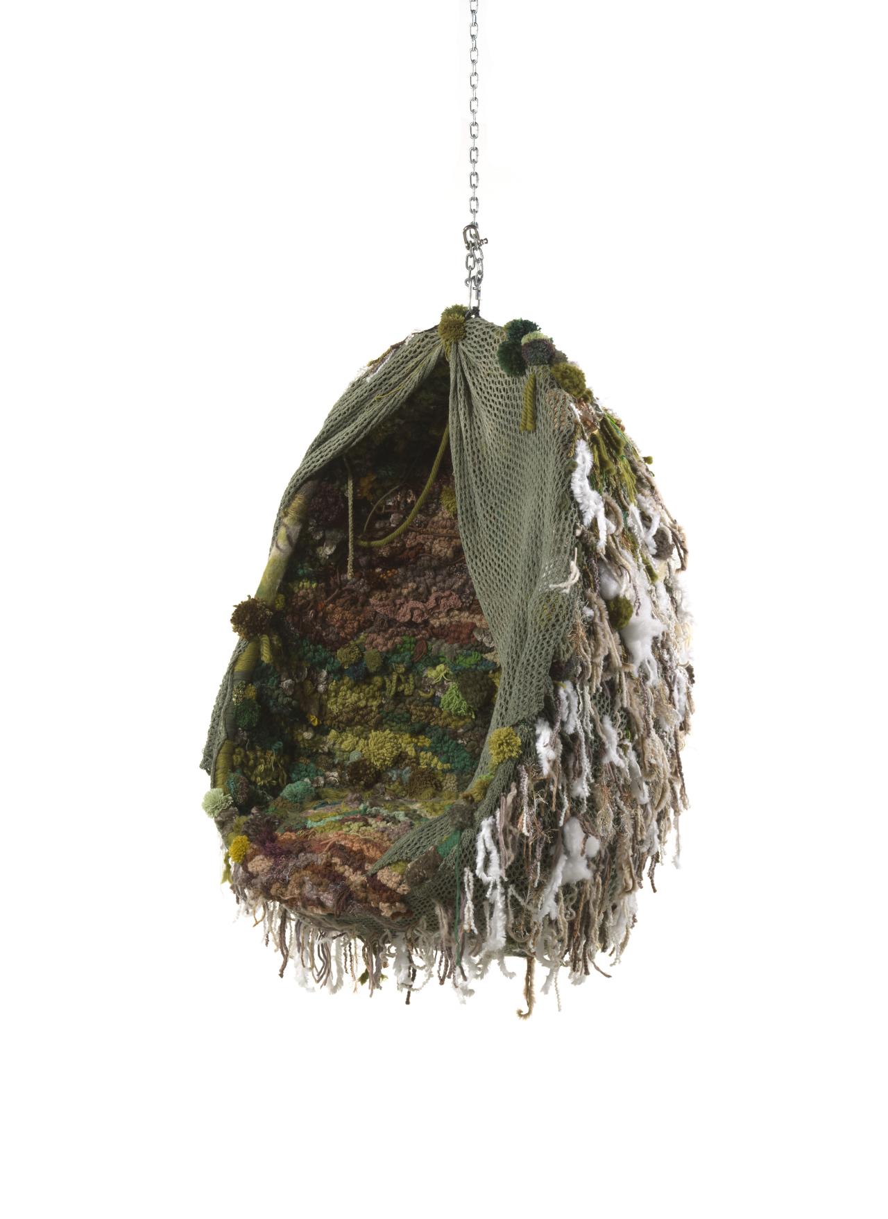 For others, the restorative power of nature was a deep source of inspiration. Trinity Flett’s Chrysalis is a garden sanctuary created with wool and beads inside a hanging pod. Viewers are invited to look closely to discover the hidden details and emerge transformed.