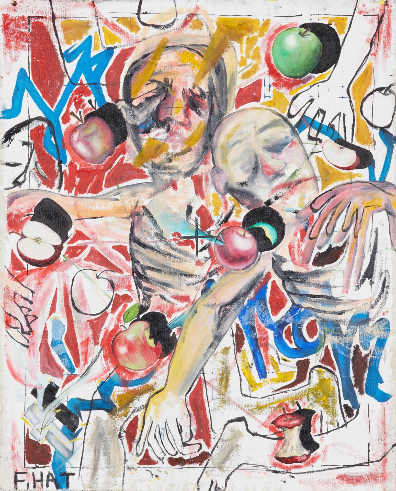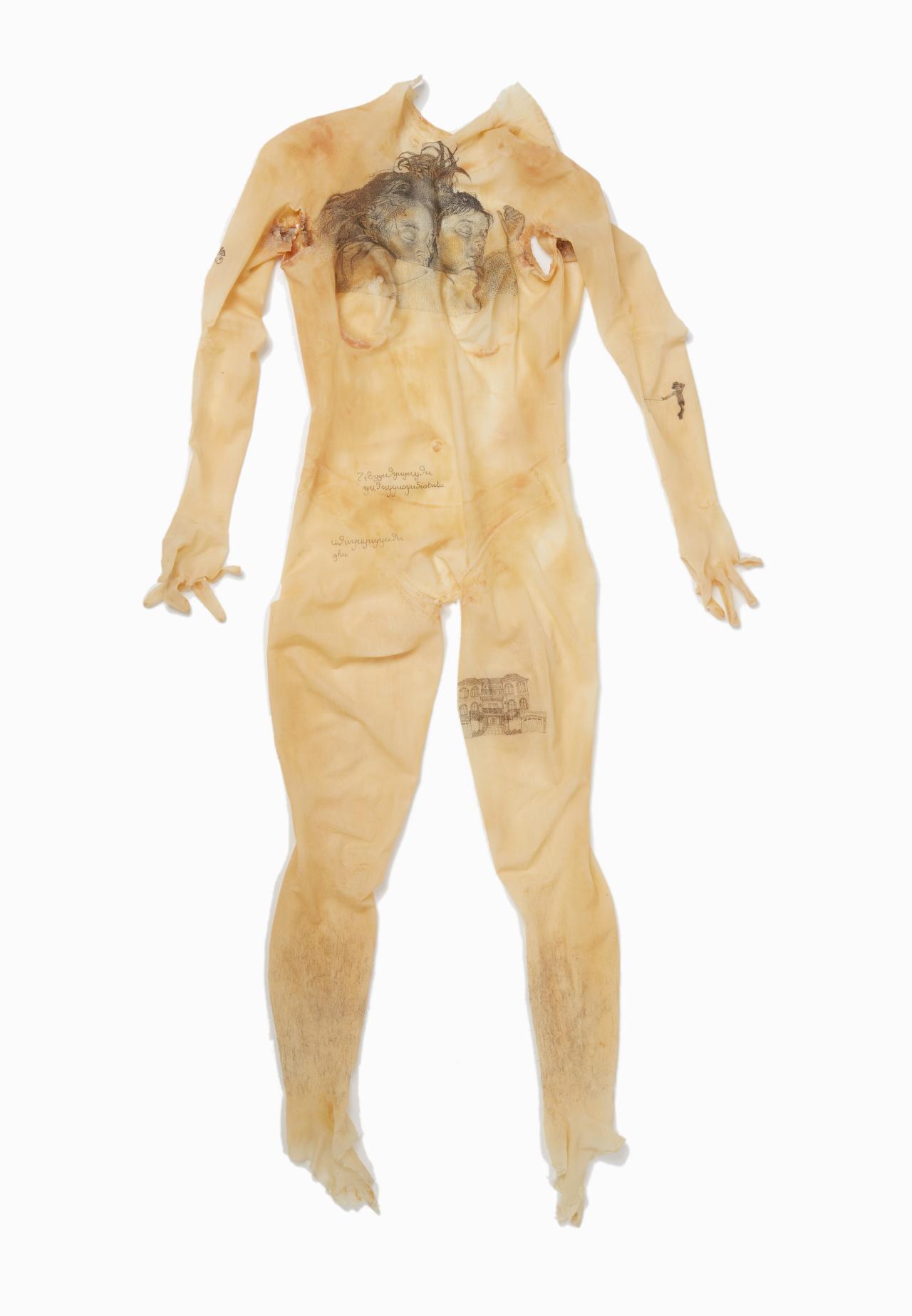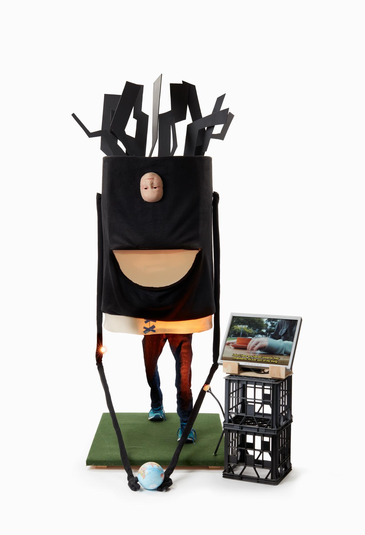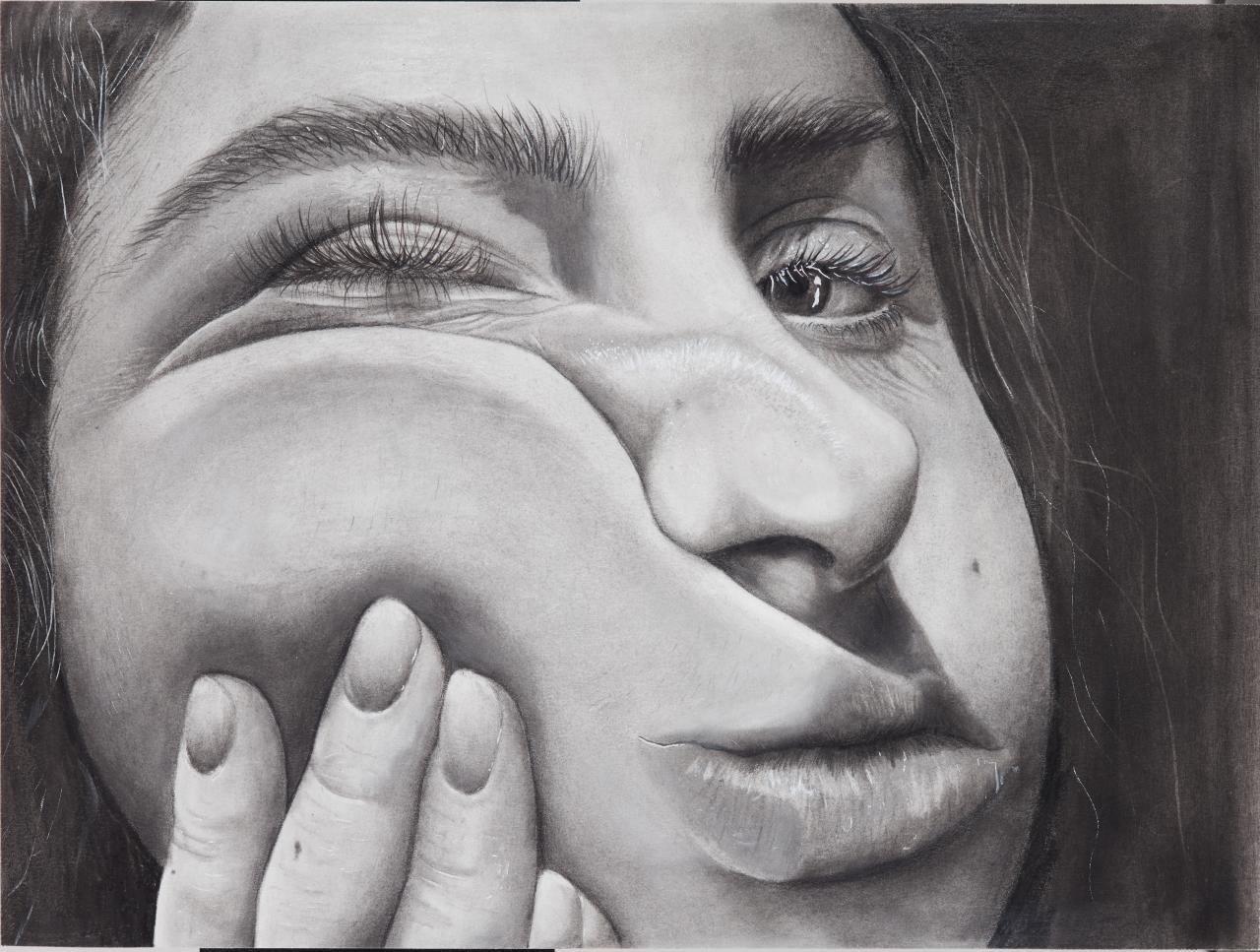 There are also works that explore how we define ourselves amid chaos. Felix Hatherley paints apples in a storm of visual information to symbolise the confusion of identity. Jirra Abrahams-Fletcher produces two monster masks which playfully portray individuals who struggle to find their place. Alex Saveski symbolically sheds a latex skin tattooed with her childhood memories as she prepares to enter the unknowns of the adult world.