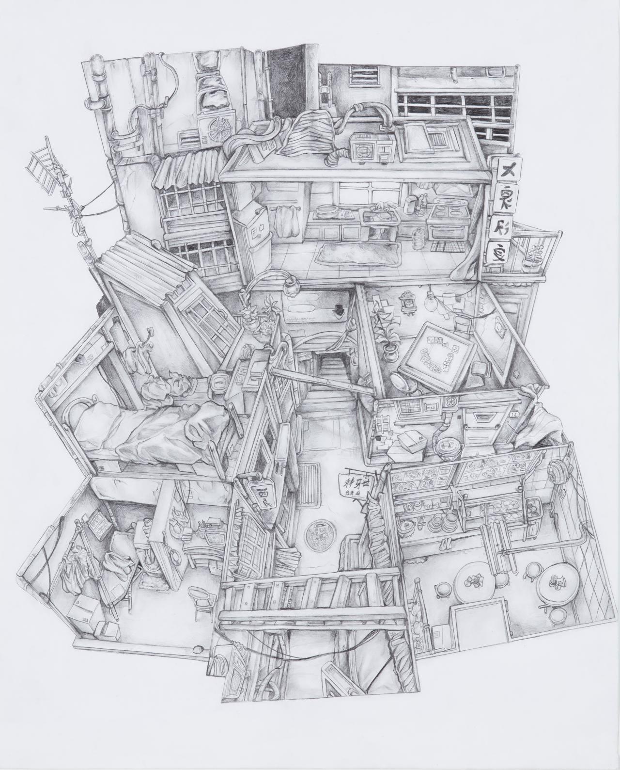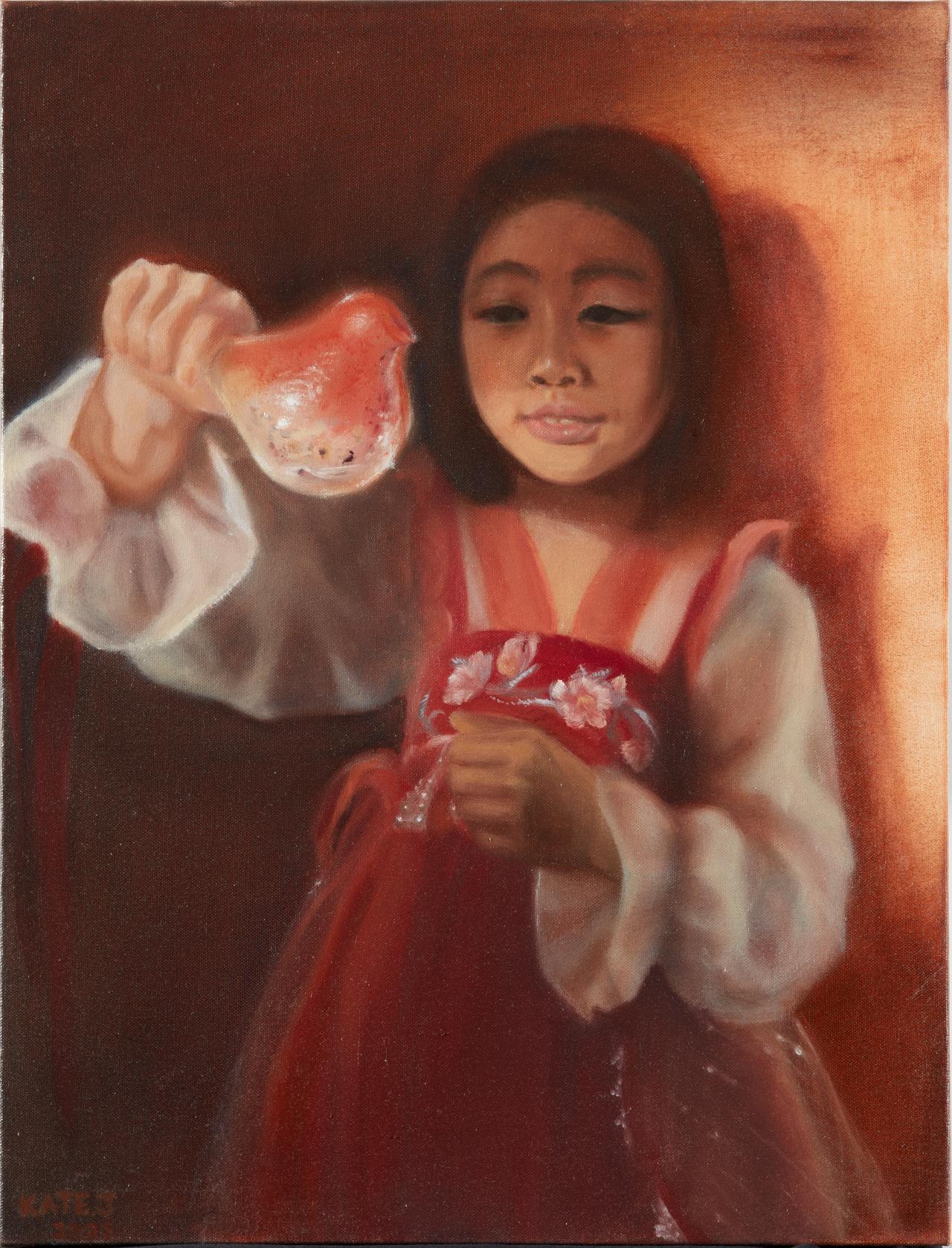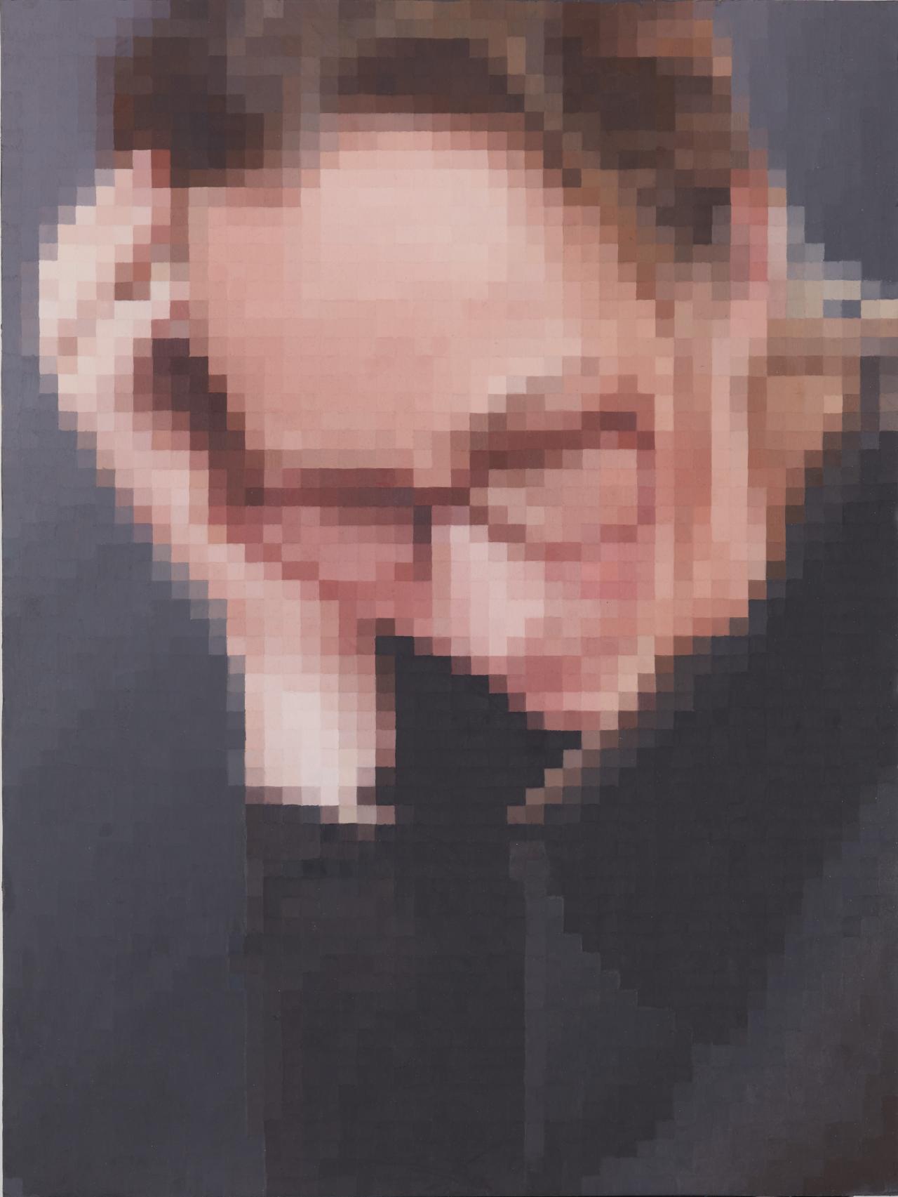 Many works explore the expressive potential of portrait painting. From many thin layers of oil paint, Kate Jing’s portraits of her younger siblings build a nostalgic, dream-like atmosphere. Heidi Cahir’s work is personal too; she paints her mother as strong and self-possessed in celebration of her resilience. Similarly, Julia Wang paints her mother’s story, evoking the alienation of immigrating to a new land. In contrast, Janis D’Souza reduces all tonal gradients in her painting to flat rectangular pixels to symbolise the dehumanising nature of the corporate world. The three figures of her triptych successively lose their detail, their texture and their individuality.