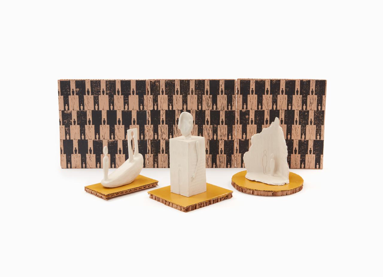 The repeated, tessellating patterns of Eleftheria Dabos’s lino prints evoke a city’s industrial rhythms. They serve as a fitting backdrop for her sculptural works, which express the emotional consequences of keeping tempo with urban life.