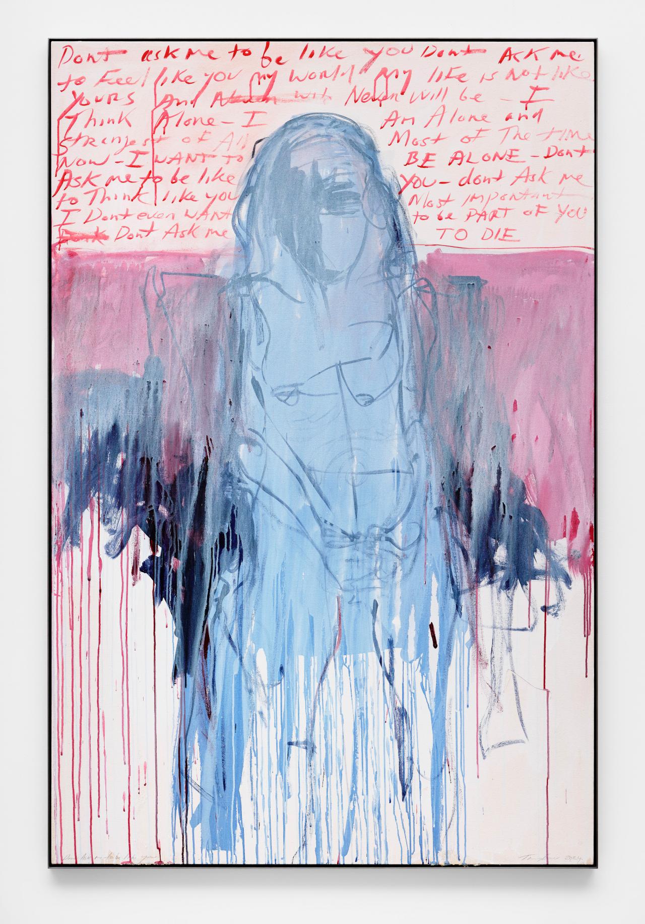 Emin’s own handwriting in the painting reads like a poem or a plea to a past lover. Emin has often used text and writing as poetic expressions of her emotions, most notably in her neon works, represented in the NGV Collection with Love Poem for CF, 2007, also generously supported by Jo Horgan AM and Peter Wetenhall. These private notes become an individual yet universal voice broadcast to her audience. In Don’t ask me to be like you, Emin’s words appear as if they could have been taken from a diary or a letter, a personal note to which we have been granted access.