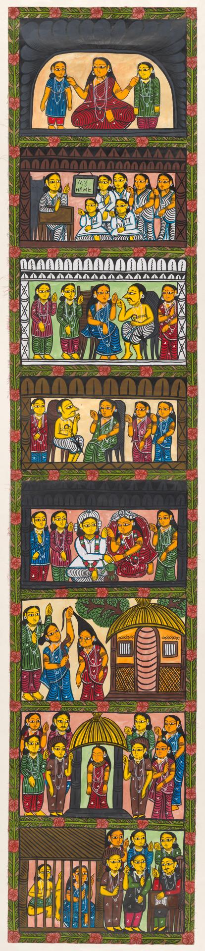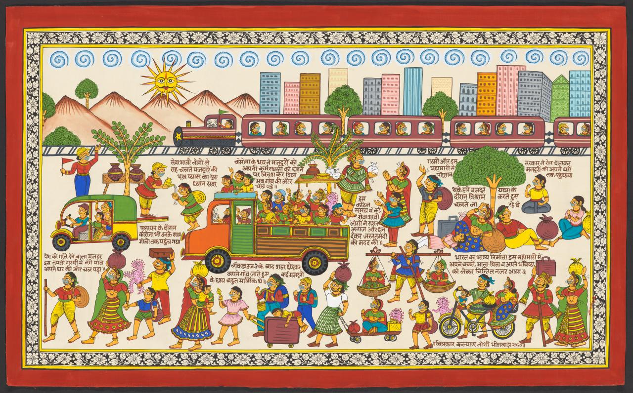 Traditional artists nowadays translate real-time, real-life events into works not merely as an aesthetic response, but as conscious chroniclers of their lives and times. This is evident in pandemic-inspired works, such as Sonia Chitrakar’s COVID scroll, 2020, and phad artist Kalyan Joshi’s Migration in the Time of COVID, 2020. The pandemic-inspired art is as much about creating awareness about the virus as it is about artists asserting themselves and not being mute witnesses to contemporary history. Joshi’s phad painting is a poignant portrayal of one of the largest mass migrations in recent times, resulting from the imposition of a sudden lockdown in India. He depicts millions of urban poor migrant labour, with no source of income, who decided to return to their rural villages, literally walking thousands of miles home. Artist-led activism is also evident in Maduhbani artist Pradyumna Kumar’s Bonded labour, 2017, in the Madhubani style of painting, where he questions the presence of such economic exploitation and enslavement in the twenty-first century, and raises issues of freedom and choice in society. Though bonded labour, also known as debt slavery, is illegal in India, there are many who fall into this trap due to a debt to their employer and have to work for no or minimal pay until the debt is paid off.