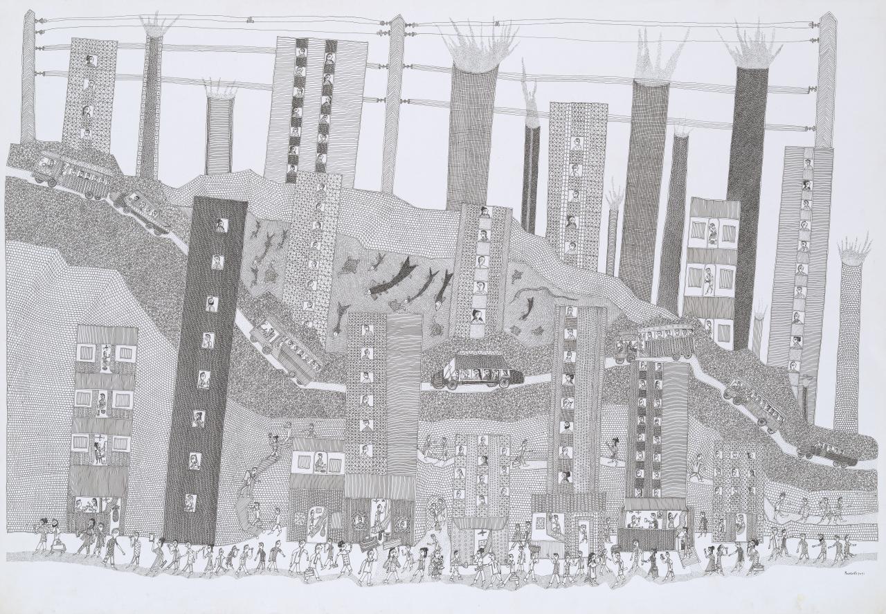 Contemporary Madhubani artist Pradyumna Kumar’s Global warming, 2017, in the Madhubani style, is a powerful warning about the state of the world, with global temperatures in 2021 reaching unprecedented high levels. Ahmedabad-based Prakash Jogi’s Cityscape, 2017, reflects his reality of living under the shadow of a massive power plant in a cramped urban settlement with a high density of human population. Both works speak of the immense degradation of nature that humans have wrought and the price that all life on earth has to pay for the mistakes and greed of one species. West Bengal artist Jaba Chitrakar’s scroll Tree Plantation patachitra, 2017, emphasises the importance of trees and the desertification that happens when trees are cut and not replanted.
