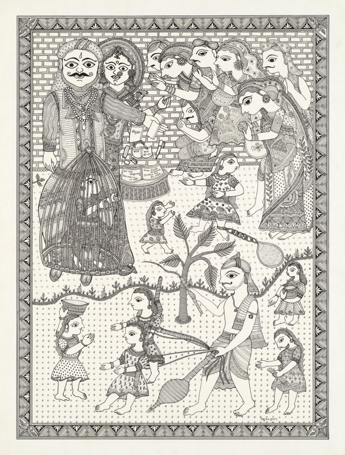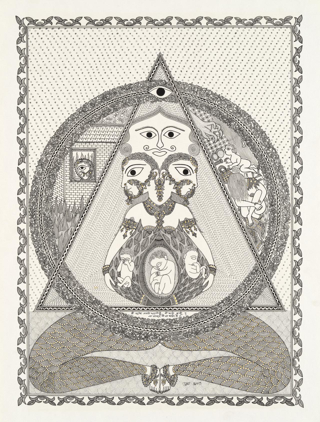 Madhubani artist Pushpa Kumari was initiated into the nuances of Madhubani art, which decorated the walls and floor of her home with auspicious murals by her grandmother, the esteemed artist Mahasundari Devi; Kumari was taught all the wall and floor drawings made in her tradition. However, it is in her feminist works, such as Coronavirus, 2020, and Female foeticide, 2017, a work that shows female foetuses huddling in a mother’s womb, where Kumari has made her mark, addressing themes that are topical and often provocative.