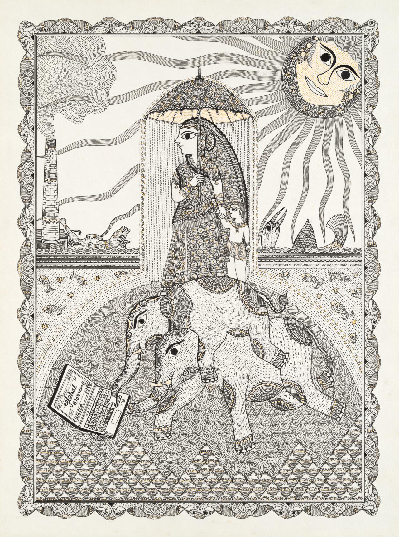 For other artists from traditional backgrounds, environmental issues and their changing relationship to the land are everyday experiences. Due to India’s rapidly growing population since the 1950s, which totals 1.39 billion today, increased urbanisation, deforestation, river dam projects and land use for agriculture has severely affected the country’s once-pristine landscapes of forests, fields, rivers and villages. Most traditional arts emphasise deep respect for Mother Earth and the interconnectedness of all life forms. In Gond paintings, humans are just one part of the circle of life and not the superior beast at the top of the pyramid – tiny insects are just as valuable. In Warli paintings, trees soar over humans because they are more important and live longer.