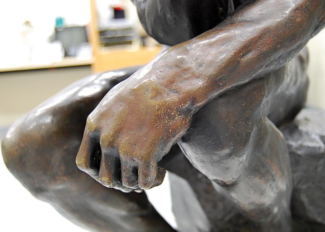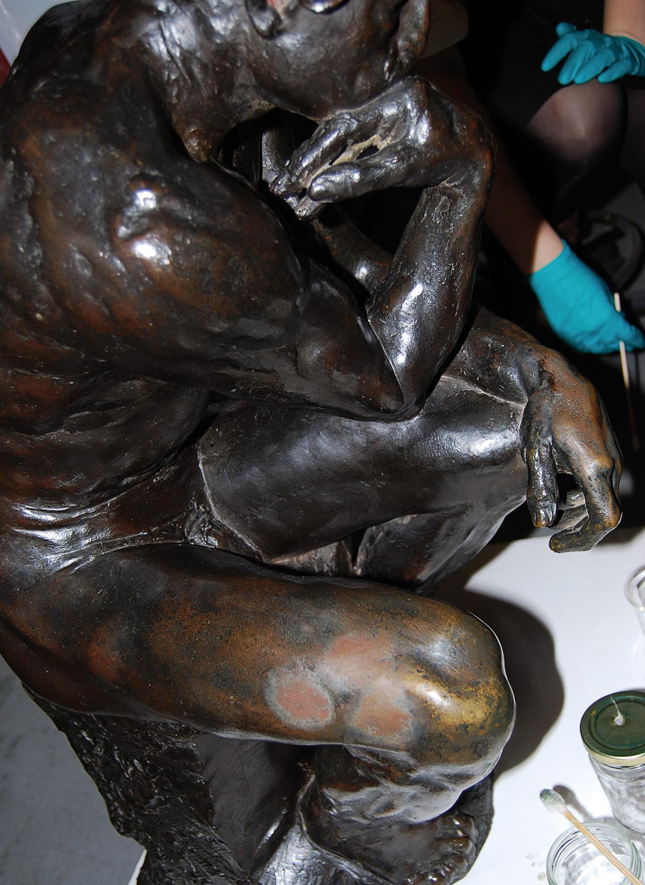 In a collection with the depth of the NGV’s it is common for important works to remain unscheduled for comprehensive conservation for many years. One of the great advantages of the NGV collection is that it has escaped the well-meaning restorations and interventions experienced by many European collections, particularly in the 1950s and 1960s. The transition from a restoration tradition to a university-trained materials conservation profession has only occurred in the past thirty-five years in Australia. Thankfully, our The thinker escaped earlier attempts to ‘restore’ it. Internationally there are a number of dark patinated, almost black versions that have been restored by stripping and re-patination after outdoor exposure. A sculpture’s patina is only original once, and continues to improve as a well-cared-for sculpture ages. Replacing a patina is sometimes necessary; however, trying to recreate an earlier appearance is difficult, and conservators are now trained to preserve original material whenever possible.