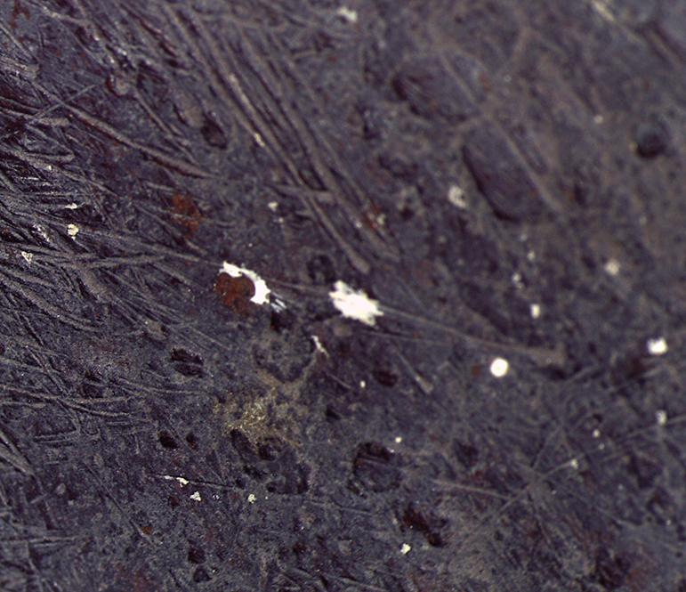 The thinker did not easily give up its history of being misunderstood, rather it gradually revealed a story. Over four weeks, solvents, poultices and chemical mixtures were tested to determine a method of cleaning the sculpture. This confirmed a history of coatings, the most tenacious of which was a black pigmented layer directly on the surface of the patina, which was resistant to all but the most aggressive (and toxic) solvents. The test patches revealed tiny windows into the sculpture’s history. Beneath the black layer it became clear that there were thousands of tiny white paint spots (fig. 7). The earliest known photograph of our sculpture pictures it high on the wall of a domed white library ceiling, in the collection of Constantine Ionides (fig. 6), where paint may have fallen out.25Anonymous photograph of Constantine Ionides’s gallery, undated (Victoria and Albert Museum, London).