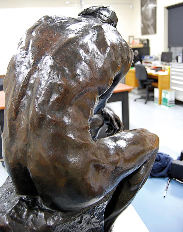 The NGV’s The thinker is also at the forefront of advances in understanding the composition of French bronze sculpture. I took a microscopic sample from the work to the Australian Synchrotron, the nation’s most sophisticated scientific instrument, for study. There, the new technology of high-resolution X-ray fluorescence mapping was undertaken with beamline scientist Daryl Howard. This revealed in unprecedented detail the distribution and elemental composition of the bronze and, perhaps most exciting of all, the thin patina, possibly only a few hundred atoms thick. A synchrotron high-resolution elemental mapping technique had never been used for this type of application before (there are only a handful of synchrotrons worldwide dedicated to advanced scientific study), and it revealed tantalising new evidence of the chemistry of the patina. Technical lessons learned and published from conserving this sculpture will influence how other important works are understood and treated. The synchrotron experiment will guide conservation efforts on other works in the future and may finally allow the patination ‘recipe’ used on early Rodin sculptures to be rediscovered.
