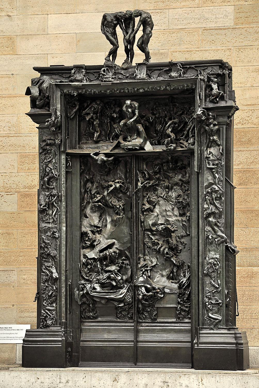 In August 1880, Rodin had been commissioned to design a door for a museum of decorative arts that the French state was planning to create. At that stage the sculptor was relatively unknown, having come to public attention only through the minor scandal aroused when he sought to defend himself against accusations of having cast his sculpture The age of bronze directly from nature; the work had been exhibited in 1877 on his return from Belgium, where he had spent nearly seven years. Rodin felt that this new commission played to his strengths and set to work with enthusiasm, drawing and sculpting numerous groups and figures inspired by the Inferno, the first part of Dante Alighieri’s masterpiece, the Divine Comedy (1472). Over the course of 1881, Rodin worked out the general composition of the commission and its principal elements; these were described in 1883 in Henley’s Magazine of Art as ‘a super-human “Dante”; a lovely and affecting “Paolo and Francesca”; and a terrible “Ugolino”. There is nothing like them in modern sculpture’.5Henley, ‘Current art’, Magazine of Art, vol. 6, 1883. The Dante figure was none other than The thinker, placed in the centre of the tympanum, while Paolo and Francesca (better known as The kiss) and Ugolino and his children at that stage of the composition occupied matching positions at the foot of the door’s two leaves.