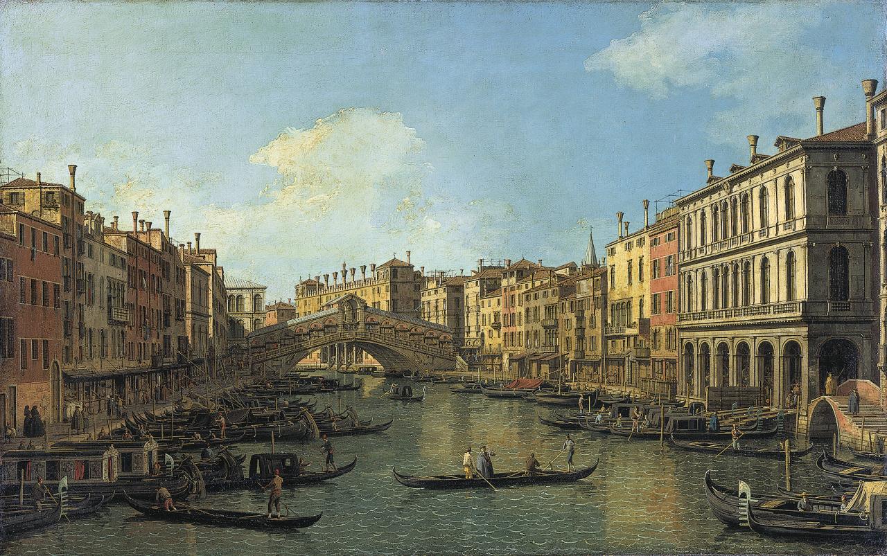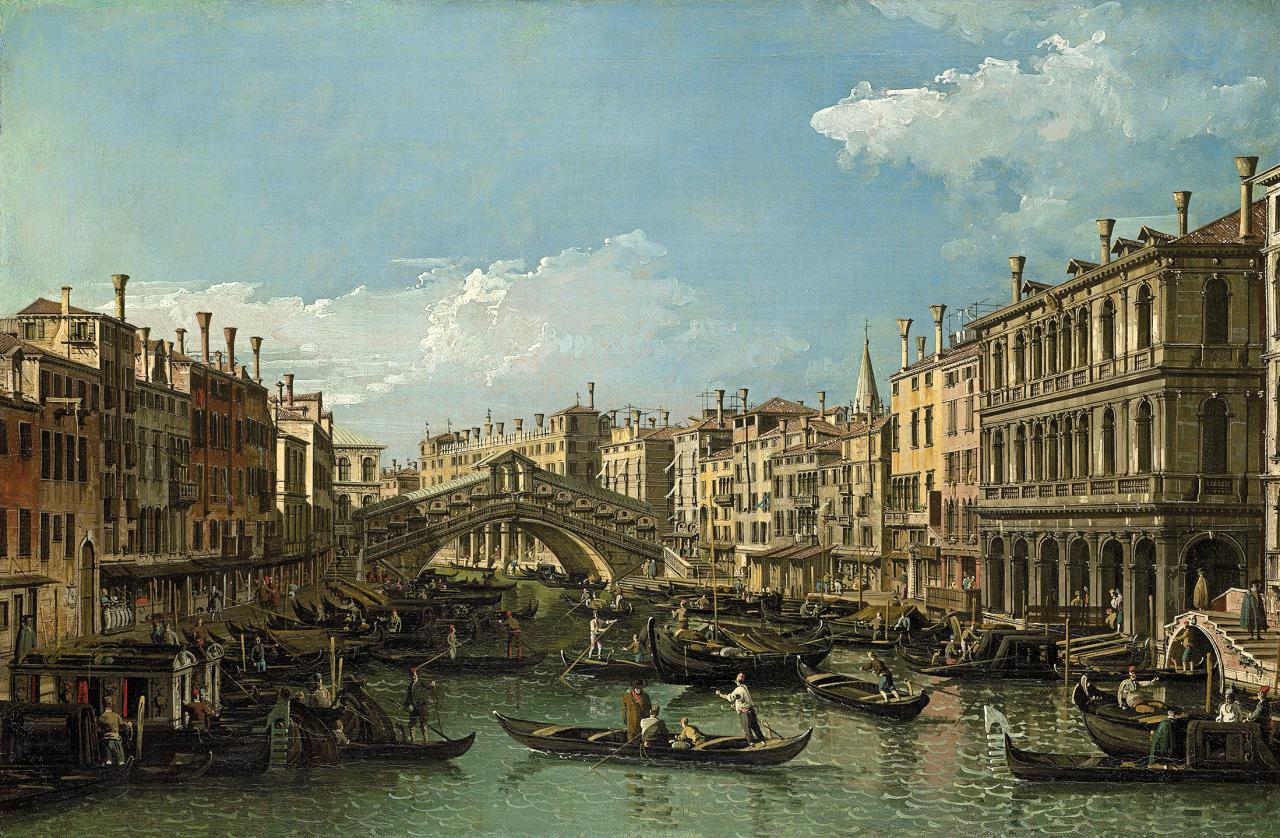 Some unusual changes in shape and proportions of the architecture are also evident. The shape of the Rialto Bridge has been compressed, with the rise of the span steeper and the arc of the underside more circular (figs 7 & 8). It is not clear why Bellotto made this alteration, which does not accurately reflect the true shape of the bridge. This, and the disproportionately oversized figures and boats on the canal, may signal some difficulty on Bellotto’s part in adapting Canaletto’s original idea to a slightly squarer format.21 Charles Beddington commented on similar infelicities in another painting by Bellotto datable to around 1738 (see Beddington, p. 667).