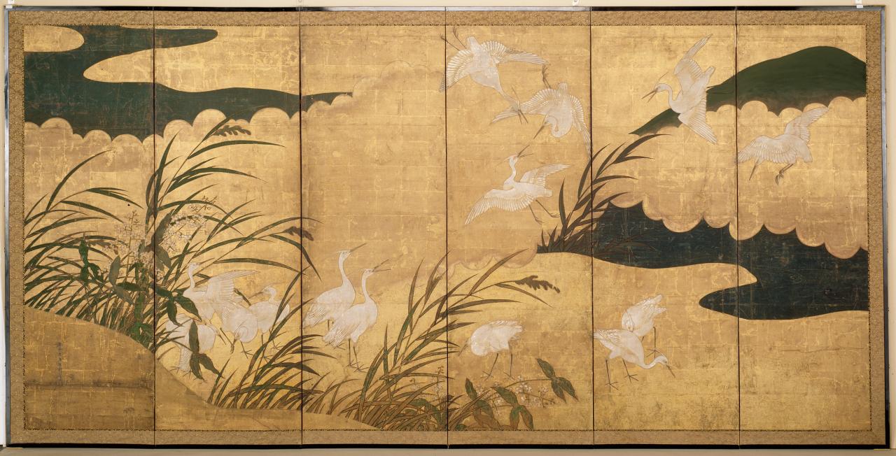 The NGV has some wonderful examples of Japanese folding screens in the Collection. The earliest screen by Hagetsu Tosatsu dates 1565. The Collection represents the usual elegant subject matter for screens, such as birds and nature, often with reference to the four seasons, but also has screens displaying other subjects, for example the interior of a horse stable, a noble ladies carriage and flower cart and evocative scenes from the famous Tale of Genji.