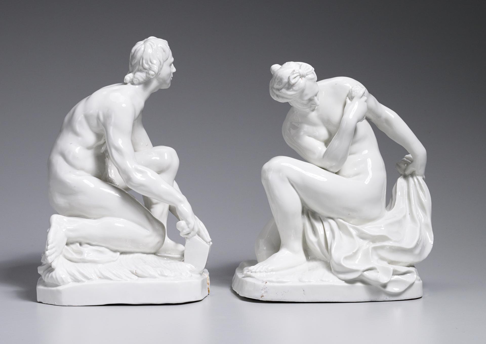 The models are ultimately derived from two famous antique marbles known from the Medici collections. Leading sculptors made copies, both large and small, of these marbles and in the seventeenth century fine versions were made to decorate the palaces of Louis XIV at Versailles and at Marly. Such free copies were highly regarded works of art. These glazed figures of Venus and her companion represent a Baroque interpretation of the antique. Fluid modelling is combined with a particular emphasis on torsion.