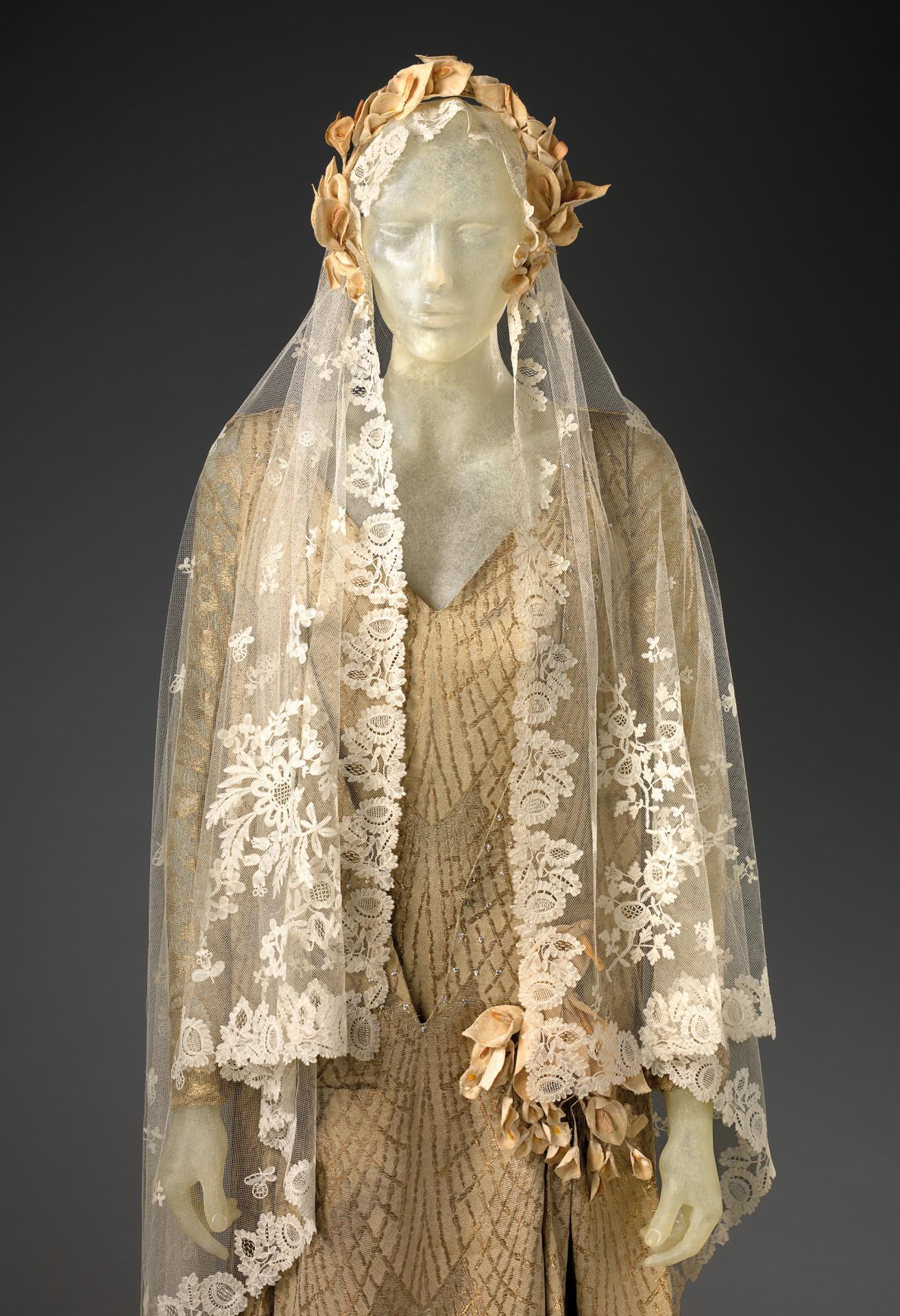 Wedding outfit is an elegant example of fashions influenced by the Art Deco style of the 1920s. Eschewing the frothy and corseted designs of the first two decades of the twentieth century, the streamlined tubular shape of the outfit reflects the modern aesthetic that came to the fore between the wars.