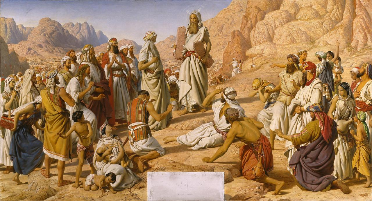 The group of figures on the right of the painting also includes the artist Bezalel kneeling in the foreground (Exodus 31:2–3). He was commissioned by God to make beautiful, holy things for the temple. Bezalel is not a major figure in this episode of the Exodus, but his presence among the crowd must have been a very personal statement by Herbert.