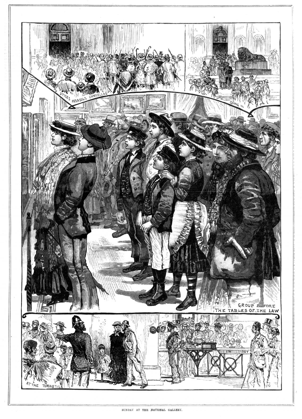 The picture hung proudly in the NGV for many decades. It continued to draw large crowds when Sunday openings first began at the Gallery five years after it was first hung, as illustrated by a cartoon in The Australasian Sketcher (fig. 5). After the delay and controversy, the committee must have been finally satisfied in their choice of Moses; not only for its deep theological symbolism and connection to power, but its ability to fascinate the public at large.