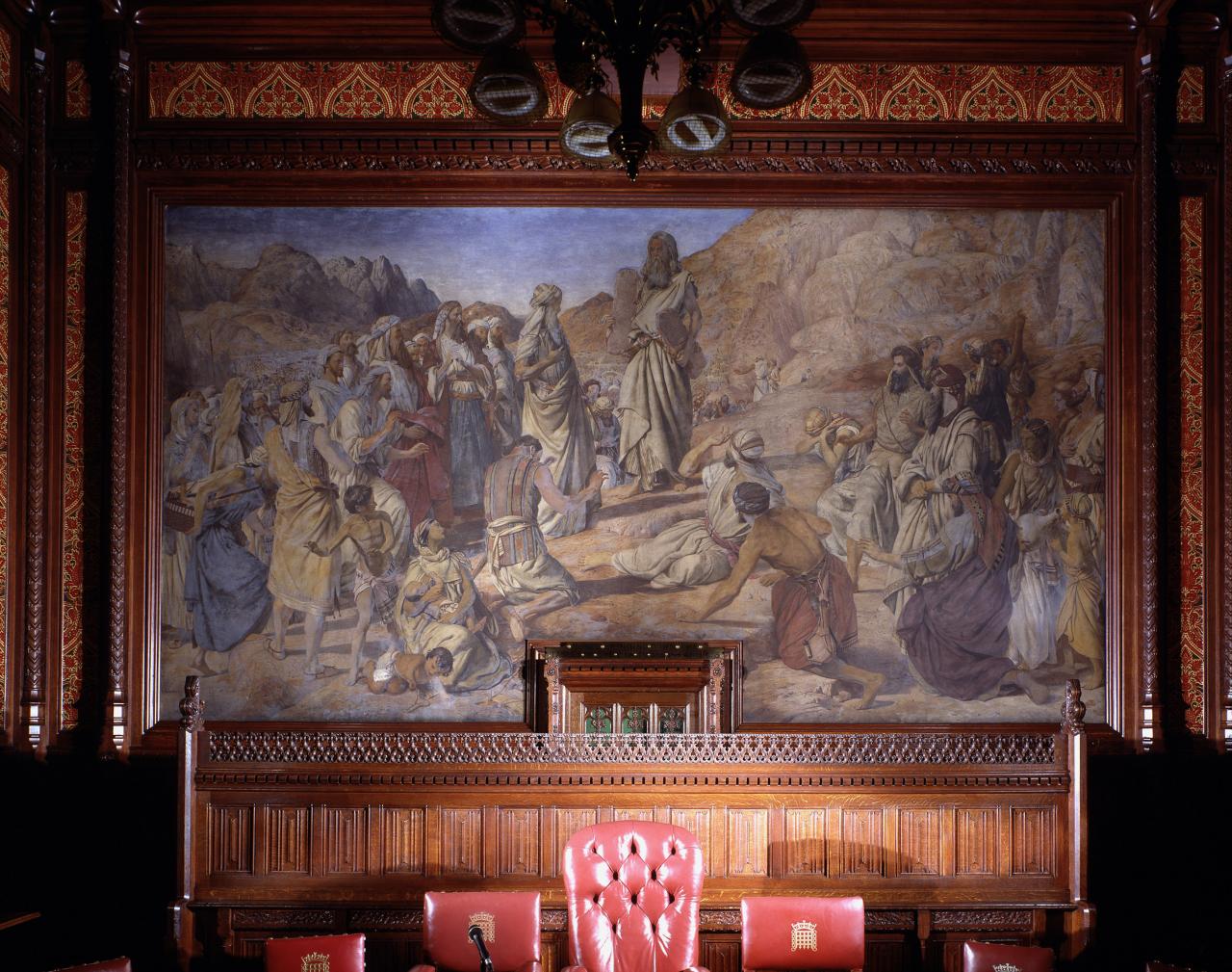 When the whole painting is read figuratively, many themes emerge for contemplation. The symbolic figures contextualise the law – it is inside, not outside God’s love and mercy. They are also a reminder that understanding and keeping the law is an impossible task without a real, mature understanding of God. The narrative is locked into a specific place and time, and yet transcends it; Herbert intended for Moses to be looking straight into the face of Christ Preaching on the Mount on the opposite wall of the Peer’s Robing Room. This would, according to Herbert, highlight Christological aspects of the scene: connecting ‘the law of Fear’ to ‘the law of Love’ and further underscoring the element of mercy when contemplating matters of law.21John Rogers Herbert, letter to John Bright, 28 Oct. 1864, British Library 43388 f212.