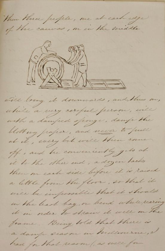 Herbert made very specific instructions as to the unpacking of the large canvas to avoid damage (fig. 4).29John Rogers Herbert, letter to Committee of Trustees, n.d., VPRS 04363/9. Though these seem to have been followed, excessive heat in the ship’s hold may have injured the picture. The blotting paper stuck, and some of the paint came away when it was unrolled. It has to be restored before it was hung in the gallery, and there was controversy around Herbert’s method of painting on paper, which he then applied to the canvas. Though Herbert claimed this method to be as durable as oil on canvas,30John Rogers Herbert, letter to Mr Wardell (most likely William Wilkinson Wardell (1823–1899), March 1872, VPRS 04363/9. it has not proved to be the case. The best argument for his unusual technique is authenticity; Herbert painted directly onto his original cartoon so that Melbourne might claim to have an ‘original’ more than a ‘copy’, and one that even pre-dates the mural at Westminster.