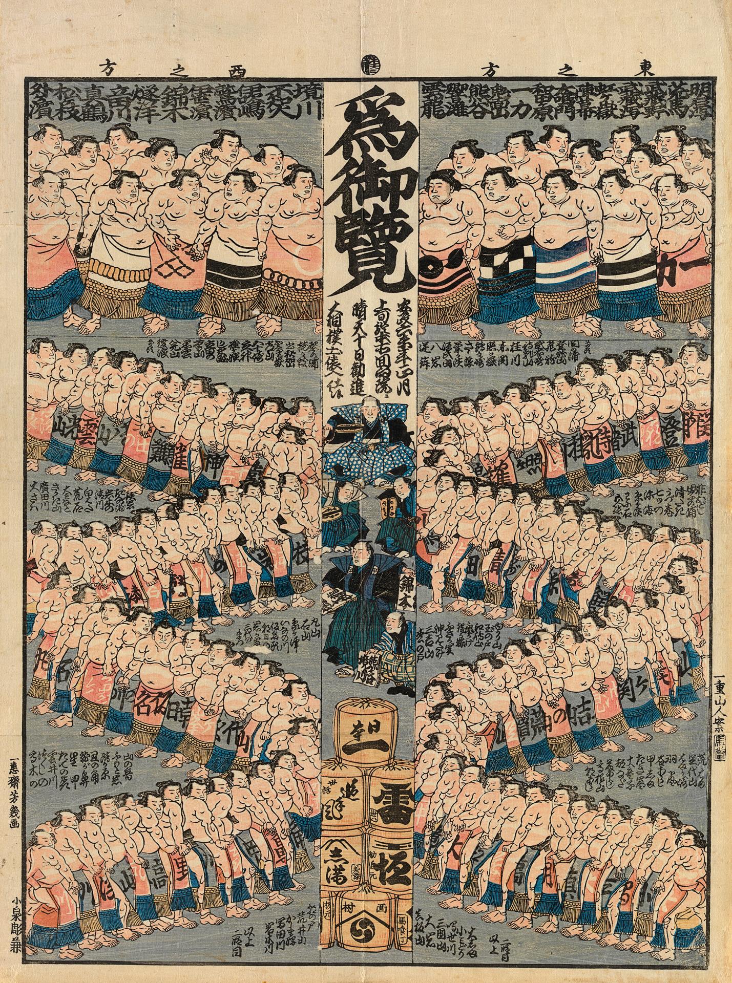 Accommodating portraits of more than 100 sumo wrestlers, along with detailed information about the tournament, within a single sheet of paper was a considerable compositional challenge. In Yoshinku’s innovative design the highest-ranking wrestlers are ranged across the top, the most famous wrestlers face-off in the middle and two cascading lines of wrestlers, lowering in rank as they descend the page, zigzag to the bottom. The awesome physical presences of the 121 sumo wrestlers are reinforced by this ranking arrangement, which includes their names. The corpulent physiques of the first rank at the top are in contrast to the diminishing figures of the lowest rank.