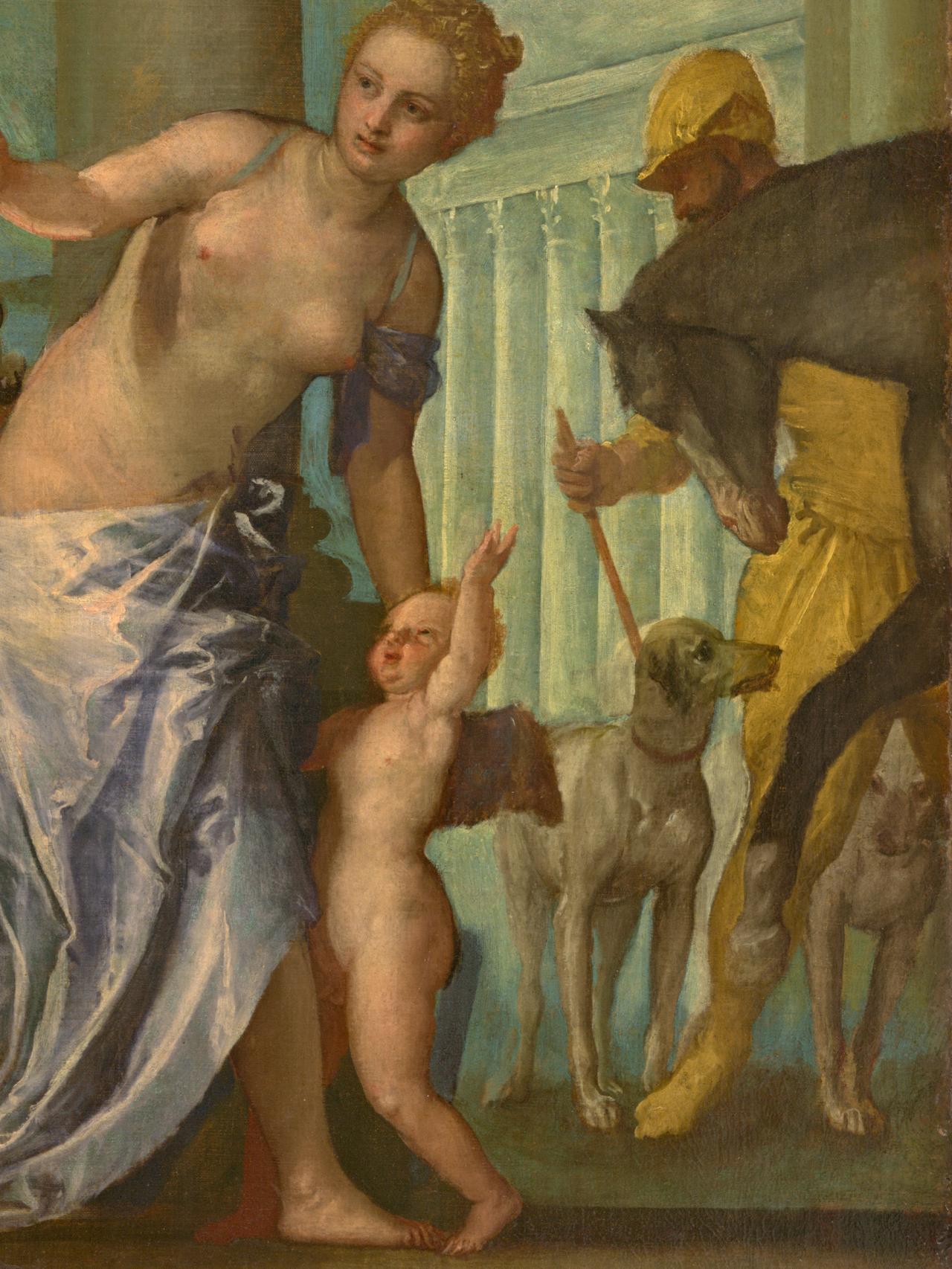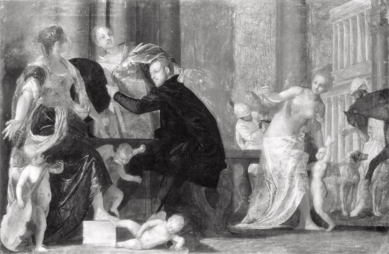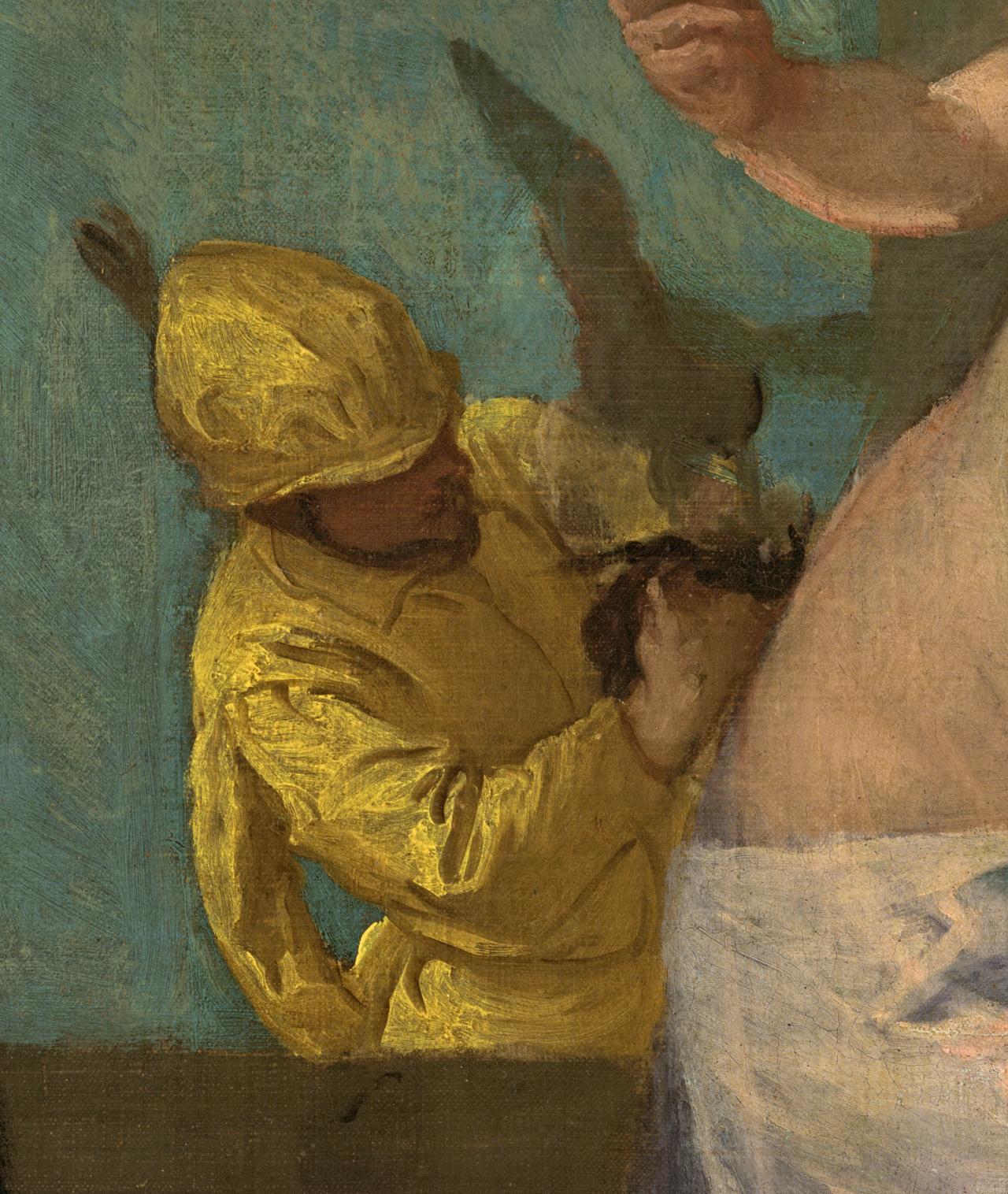 If we accept, at least in part, the hand of Paolo Veronese in the painting, what does this study add to our knowledge of the work? As Beverly Brown points out, our view of what constitutes a ‘Veronese’ at the end of the twentieth century is much altered from that of the sixteenth-century patron.10Beverly Brown, ‘Replication and the Art of Veronese’, in Studies in the History of Art, vol. 20, National Gallery of Art, Washington DC, 1989, p. 121. The painting before us presents a mixture of skilled and clumsy brushwork, of expensive materials and awkward anatomy. There is a sense of struggle with the detailing of the work. But the question is, whose struggle was this? Could so much alteration be the work of studio assistants? In what context was this painting begun and in what context was it finished?