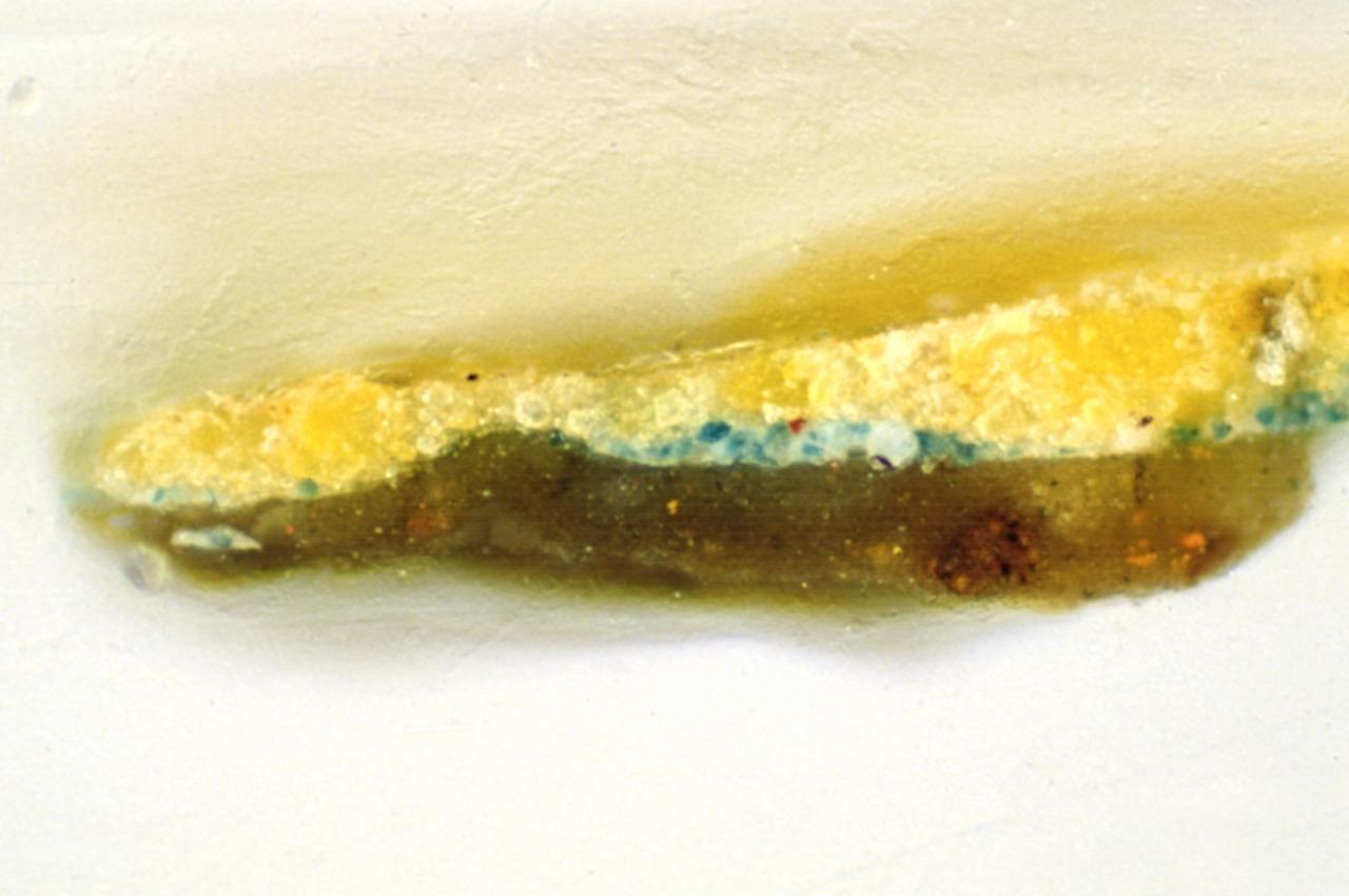 Cross-sections have been made through a number of areas of the paint layer to allow observation of the layer structure and pigment content. Though the layering is complex, microscopic examination suggests that some of the forms have been blocked in using the grey-brown layer that predominates in the background, and then defined by means of the blue layer. In some instances the painting was brought to a reasonably complete state, as in the head of the female at the right, before the blue background was brushed in – in other instances, as in the central falconer, we can observe that the shape was brought to a level of finish, then defined by the background, and then detailed again over the blue (fig. 5). The falconer’s bird may have been consciously left undetailed or may reflect, in part, the unfinished state of the painting, though the bird’s form has been altered. This working and reworking of the image is complicated by the inconsistency of the brushwork. This is most noticeable in the treatment of the extremities of the figures and most graphically represented in the handling of the yellow garments of the falconer and the groom (figs 6 and 7).