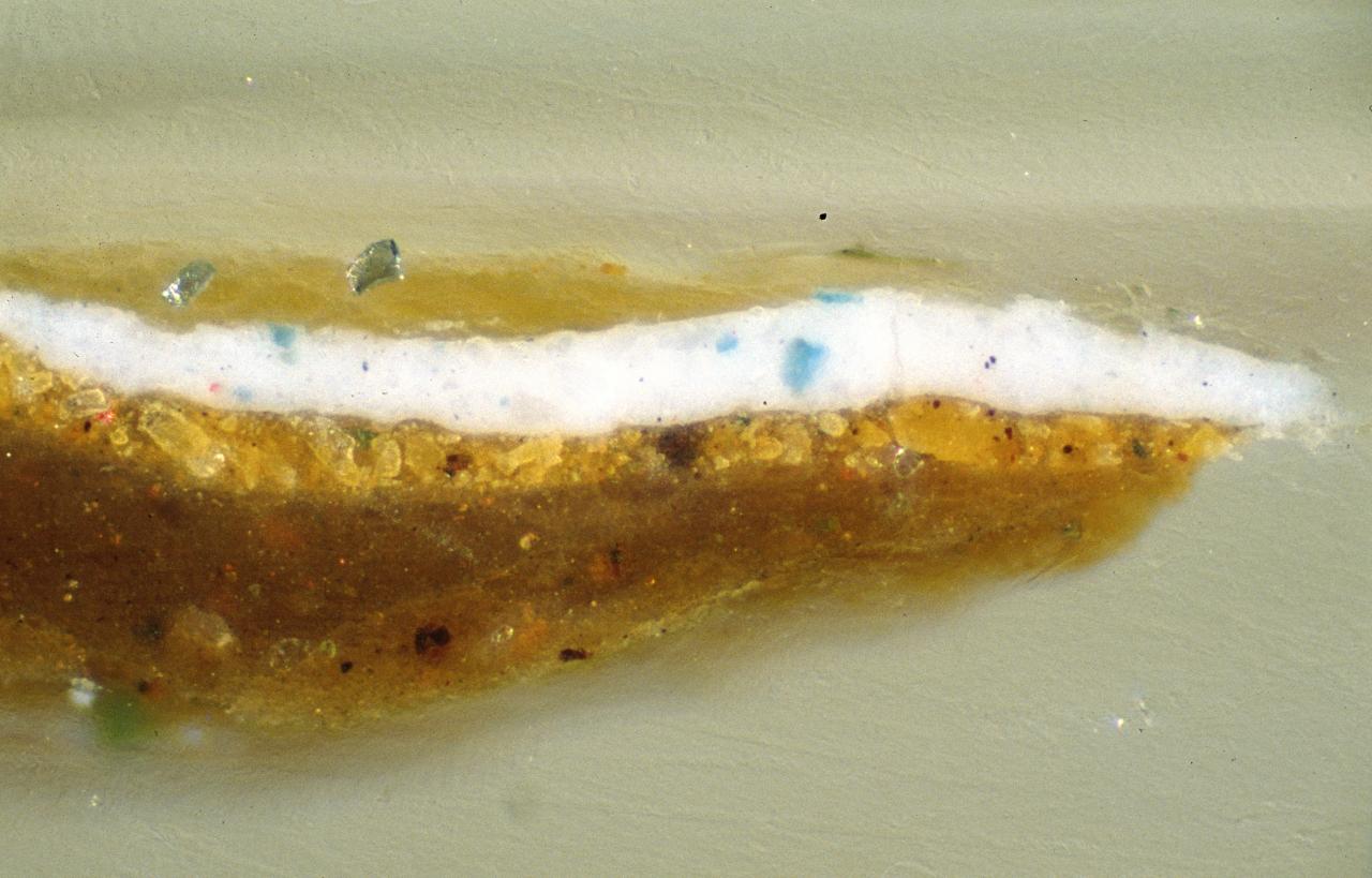 The cross-sections examined have not shown evidence of dirt or traces of resin between paint layers, suggesting a relatively continuous development of the image. The white columns at the right of the painting are not a residue of unfinished work but are the last layer of paint to be put in place (fig. 8).