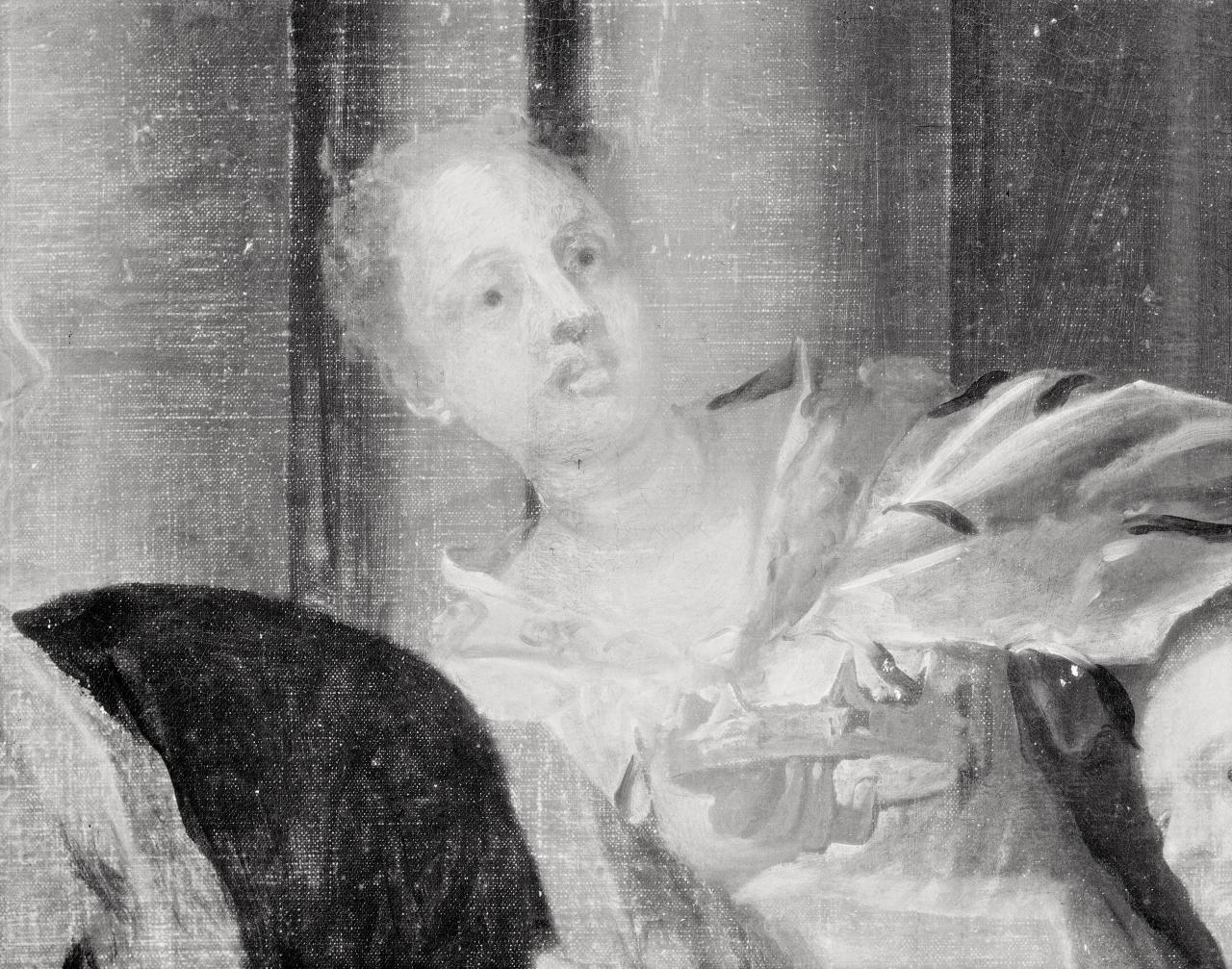 Neither infra-red photographs nor radiography have revealed extensive underdrawing. That which appears occurs in the stool on which the gentleman sits, the leg of the table, and to some extent the bodice of the woman on the left. Incised line work can also be discerned under this bodice, suggesting the form of a belt.