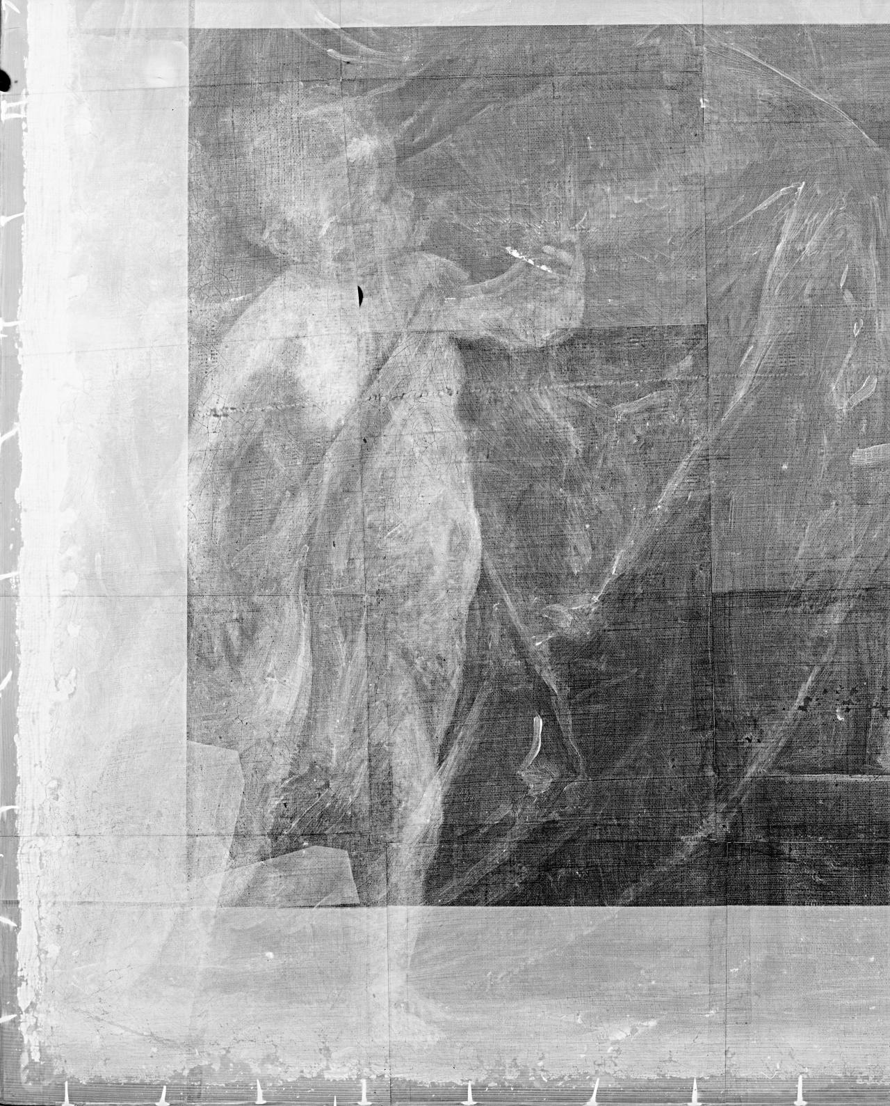 The most notable features of the paint layer are the numerous pentimenti and inconsistencies in handling. These are visible in part with the unaided eye but are more readily documented with infra-red photography (fig. 3) and radiography (fig. 4).