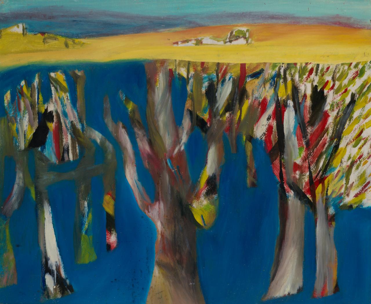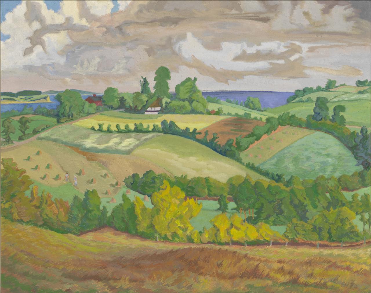 At some point Heckel decided to hide Great dancing pair by covering it with a layer of distemper, which was only removed recently. As many of Heckel’s paintings were destroyed during the Second World War – including almost half the paintings he made before 1919 – the discovery of this work marks a wonderful addition to our knowledge of Heckel’s work. Great dancing pair was thought to have been lost or destroyed, so its reemergence is significant. The landscape painted in 1939 would have been considered relatively safe and non-confronting in the eyes of the authorities. Many of Heckel’s works at this time were landscapes and still lifes. This landscape still displays German Expressionist qualities through its use of bold colours, which sharply define many distinct areas of the well-worked countryside. Because the painting remained in Heckel’s possession until he passed away in 1970 it must have been of great personal value to the artist, and he included it in many exhibitions after the war.