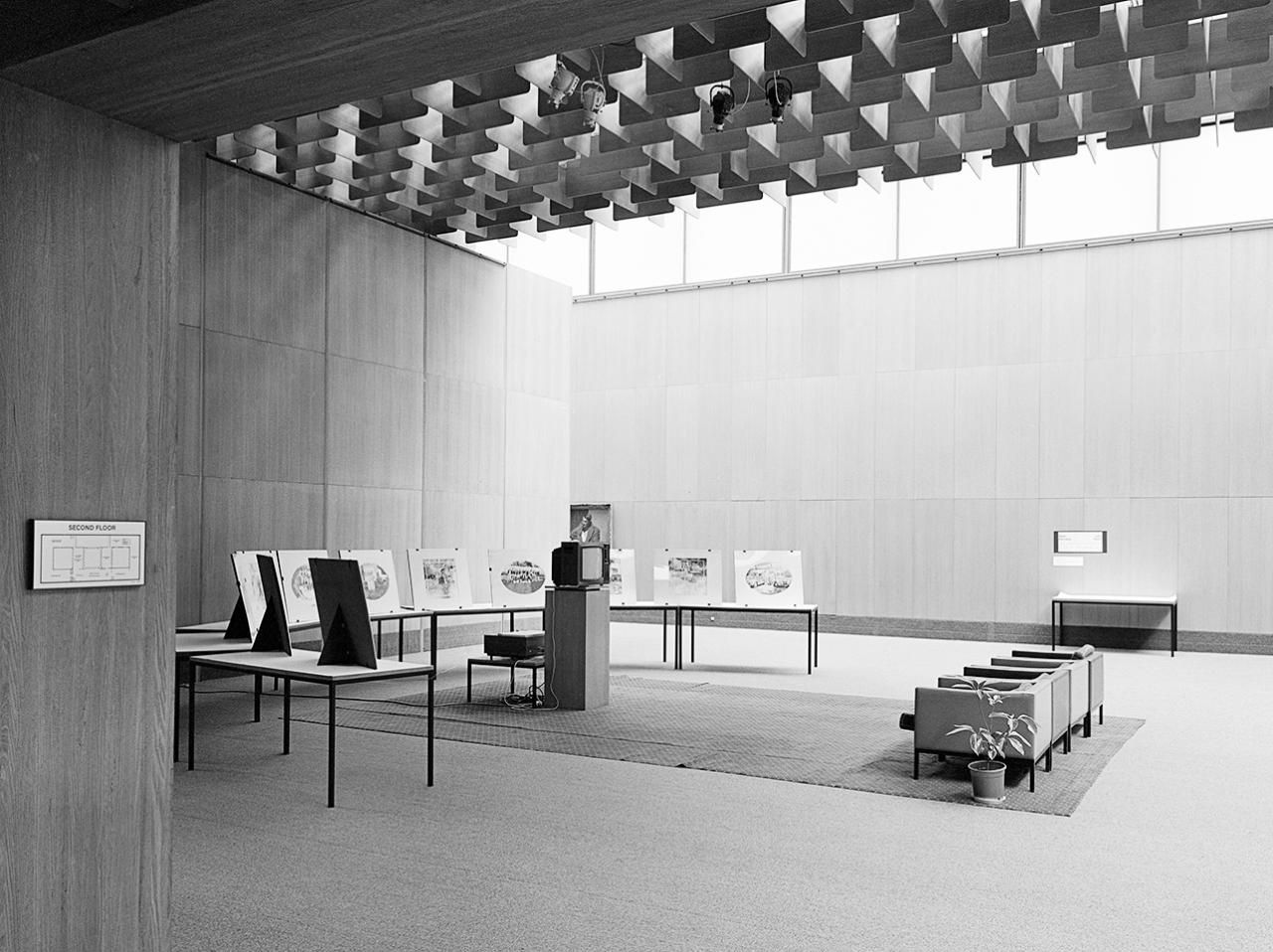 In the meantime, an exhibition of Australian non-object art curated by Jennifer Phipps and Geoff Burke, titled Performance, Documents, Film, Video, was presented at the NGV from 28 August to 28 September 1975 (figs 6 & 7).32Geoff Burke & Jennifer Phipps (curators), Performance, Documents, Film, Video, National Gallery of Victoria, 28 Aug. – 28 Sept. 1975. The exhibition included performances by Burns (with Judi Stack), Chris Mann and Paul Prendergast. A number of works by conceptual artists, including Ian Burn (Mirror piece, 1967), Mike Parr (150 programs and investigations, 1971–72) and Robert Rooney (A.M. P.M., 1974), were also included in the performance aspect of the show. The documents component included works from Michael Callaghan (Six works, 1974), Aleks Danko (the chair is not a tourist, 1975), John Fisher (Art/Being documentation, 1972–75), Mel Ramsden (A preliminary proposal for the directing of perception, 1969) and an early version of Kennedy’s Introductions, 1974–75. Films shown included Danko and Joan Grounds’ We should call it a living room, 1975, Parr’s Rules and displacement activities 1, 1973–74, Kennedy’s Other than art’s sake, 1973–75, and Kennedy and Parr’s Idea demonstrations, 1972, in which video was an essential aspect, although much of the work was shot on 16 mm film.33For the full list consult Geoff Burke & Jennifer Phipps Performance, Documents, Film, Video, National Gallery of Victoria, Melbourne, 1975.