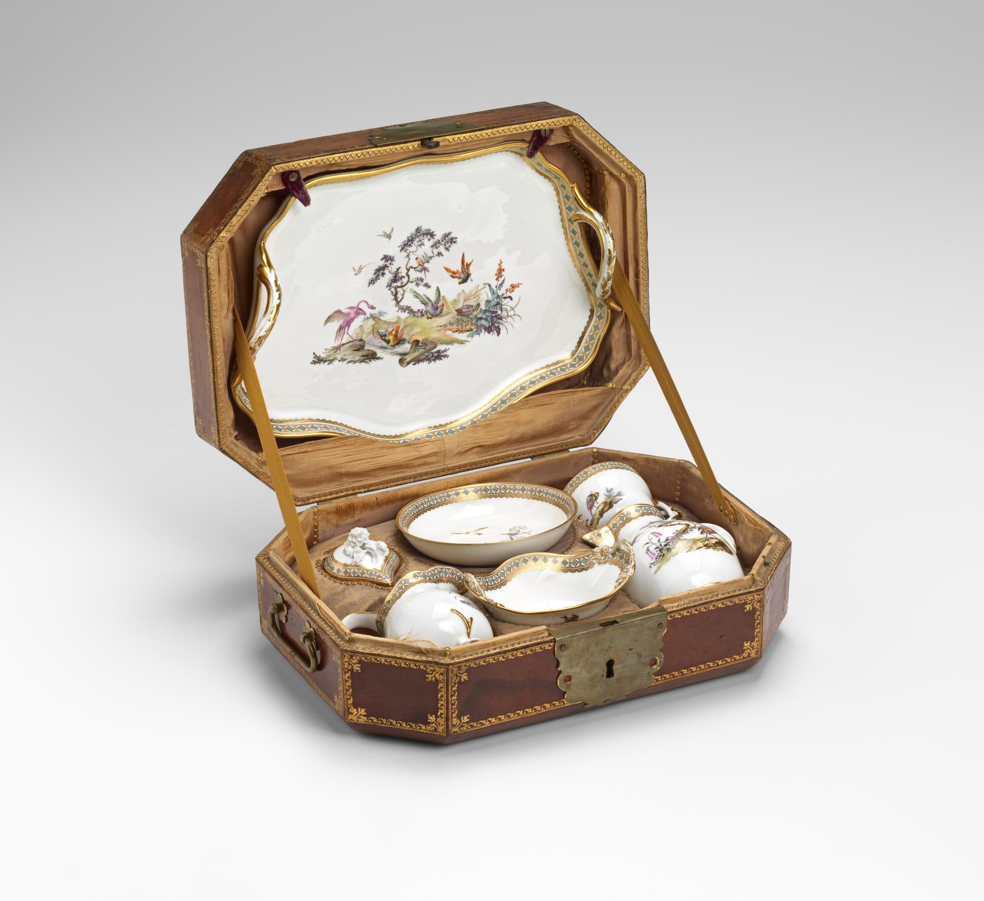 The present Vienna solitaire includes a serving tray, or tablette, a cup and saucer, a hot water jug, a milk jug and a basket for crystal sugar, all decorated with painted and gilded borders and superbly painted scenes of exotic birds. The components of the service are contained in the original custom-made, red silk-lined, gilt-stamped morocco leather case with a fitted interior. A service of this type could have been used to take any hot drinks – tea, coffee or chocolate – and a silver teapot, coffee pot or chocolate pot would have been used with the porcelain to serve the beverage itself.