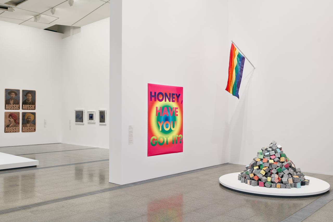 Loud or quiet, these are all valid forms of activism and protest. Likewise, the events that provoke these actions can be big global issues, such as climate emergency, feminism, the Me Too and Black/Blak Lives Matter movements, or other issues of justice and discrimination, as well as deeply individual, personal issues that play out in the family home, in school or socially. In this exhibition theme, we see art and design as a vehicle for highlighting the things that matter to us, and the different methods that artists use to achieve this. This includes the traditional use of flags to denote a unified community such as Yara Said’s Refugee flag, which was designed for the first Refugee Olympic Team in 2016, or Gilbert Baker’s Rainbow flag, designed in 1978, which became an international symbol for LGBTQIA+ communities. Peter Drew’s Aussie street poster series, funded by the NGV’s Supporters of Prints and Drawings, embrace the neglected histories of Australians the artist learnt about when he discovered their portrait photographs in the National Archives of Australia, to expand ideas about national identity. Ancient vases – hallowed for their age and cultural association – and repainted to obscure their origins become a form of protest for Ai Weiwei in his Coloured vases, 2015, supported by Loti & Victor Smorgon Fund, and Pascale Marthine Tayou’s granite Coloured stones (Pavés colorés), 2015, funded by Suzanne Dawbarn Bequest, reference the rubble and ruin of revolutionary altercations that have occurred throughout history.