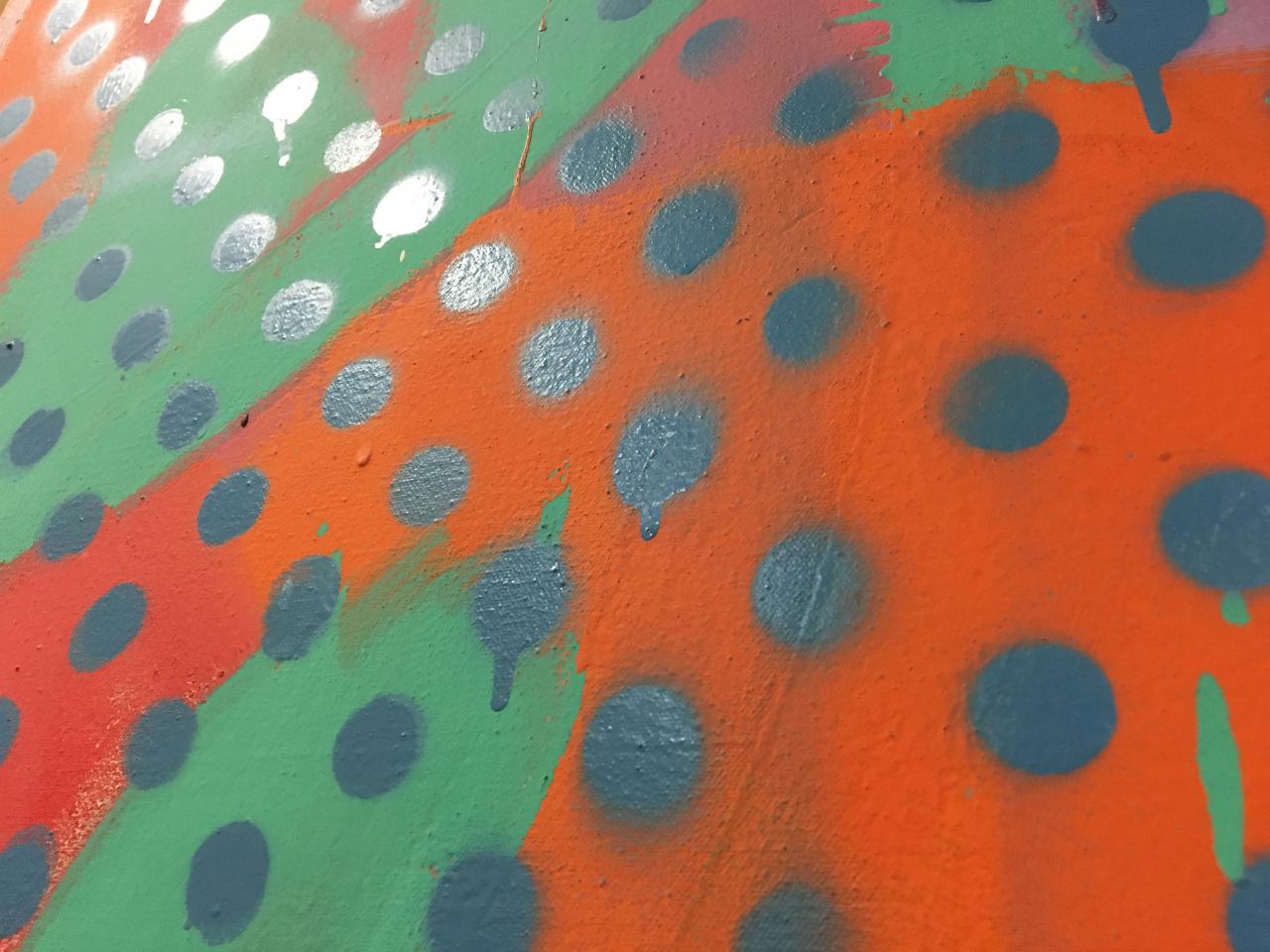 The blue dots have a gloss sheen that produces a subtle optical effect (like sunlight glistening on drops of rain, as per the painting’s title). They are made with a Prussian blue pigmented alkyd paint often referred to as ‘enamel’, a generic term applied to high gloss paints of all types. Paint drips and a spray halo are visible across the dots indicating that they were applied by spray can and stencil. Watkins used the effect for the first time in 1968. Four years later, in 1972, Daniel Thomas described Watkins’s 1972 use of enamel paints as a homage to Pollock, but he also explained how the