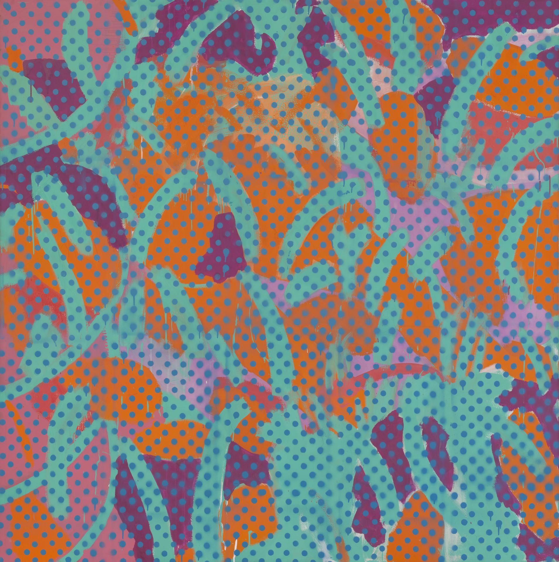 In 2014 Rain in West Pymble (1968) was acquired by the National Gallery of Victoria (NGV) with a different title: Dusk at 97A, 1968. For over three decades, Rain in West Pymble was the title of a different painting by Watkins held in the Chandler Coventry Collection at the New England Regional Art Museum (NERAM). The stylistic similarities may have contributed to the switch in the titles of these two paintings decades earlier. Both paintings feature gestural forms and painterly lines of vibrant colour with cool undertones, over which stencilled dots have been applied in a grid-like formation. The use of dots in this manner is particularly distinctive to these two paintings and rarely appear in Watkins’s other works from this period.