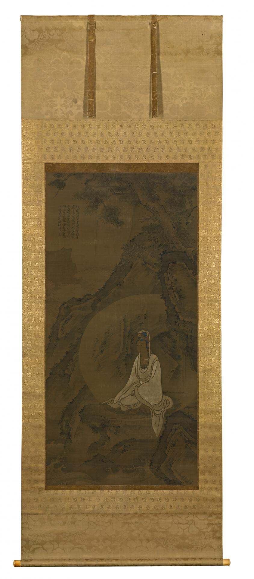 What makes this scroll especially important and interesting is the fact that in the upper left corner there is an inscription by the monk Huiming (1316–1386), abbot of the Chan (Zen) Buddhist temple Lingyin si. This temple, founded in 326 AD, is located near the West Lake in Hangzhou, Zhejiang province. In the inscription, Huiming eulogises the Buddhist virtues and the efficaciousness of the Bodhisattva Guanyin. He also comments on the landscape, in the following lines: ‘Overhanging cliffs and precipices are solitary and silent; Cascading waterfalls and lofty pines reflect each other in quiet stillness’. Huiming was abbot of the Lingyin temple from 1378 to 1386 and it is likely that he inscribed this painting at some time during this period. The painting itself could have been commissioned by the temple at about the same time or slightly earlier, but cannot postdate 1386, the year of Huiming’s death.