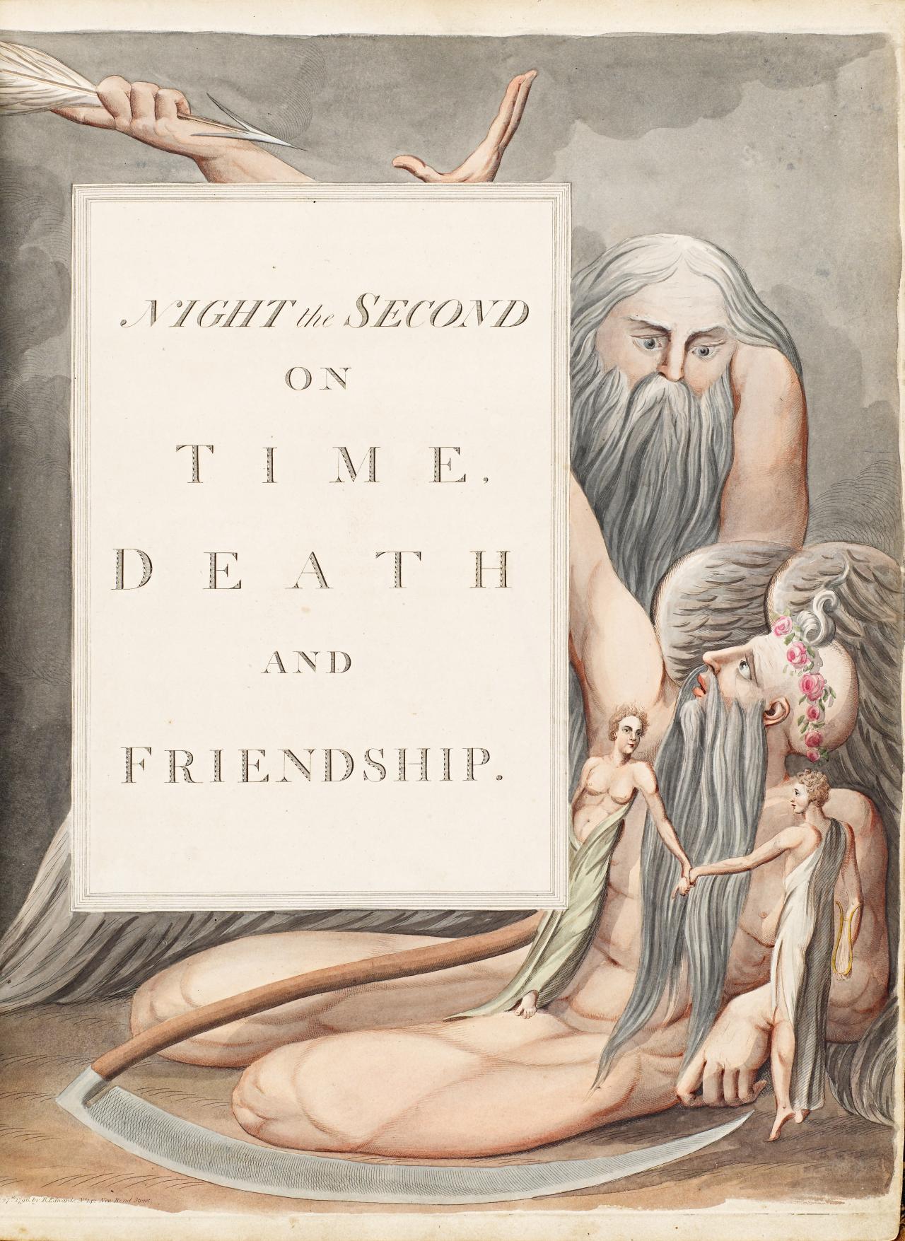 A peculiar feature of the 1797 edition of Night Thoughts is that some copies contain an early state of the title-page for ‘Night the Second’ of Young’s poem (fig. 3). This state has been discussed in the introduction to the Clarendon Press edition of Night Thoughts.7ibid., pp. 21 ff., 56. It is the third of the four states of the engraving and is most notable in retaining from the second state, though in a less egregious form, feminine breasts on the figure of the (otherwise clearly masculine) friend who stands in the lap of Time. In the second and third states this friend also has a pot-belly and a provocative smile. In the final state, the one found most frequently in copies of the 1797 edition, this figure is fully masculine and his smirk is removed. The third state has been observed in two of the coloured copies, now in the Pierpont Morgan Library, New York, both of which are in the Green Death group (following the colouring given to Death’s robe on the title-page to ‘Night the First’); accordingly they are placed together as Type IIA–1 and IIA–2 by the Clarendon editors.8ibid., p. 22. However, the colouring in these two copies is not so striking as to have drawn the attention of the editors particularly to the androgynous quality of the figure. Such is not the case with the à Beckett copy, where the more rounded style of outlining tends to emphasise, rather than mitigate, the feminine breasts, and where no attempt is made to diminish the friend’s effeminate smile.