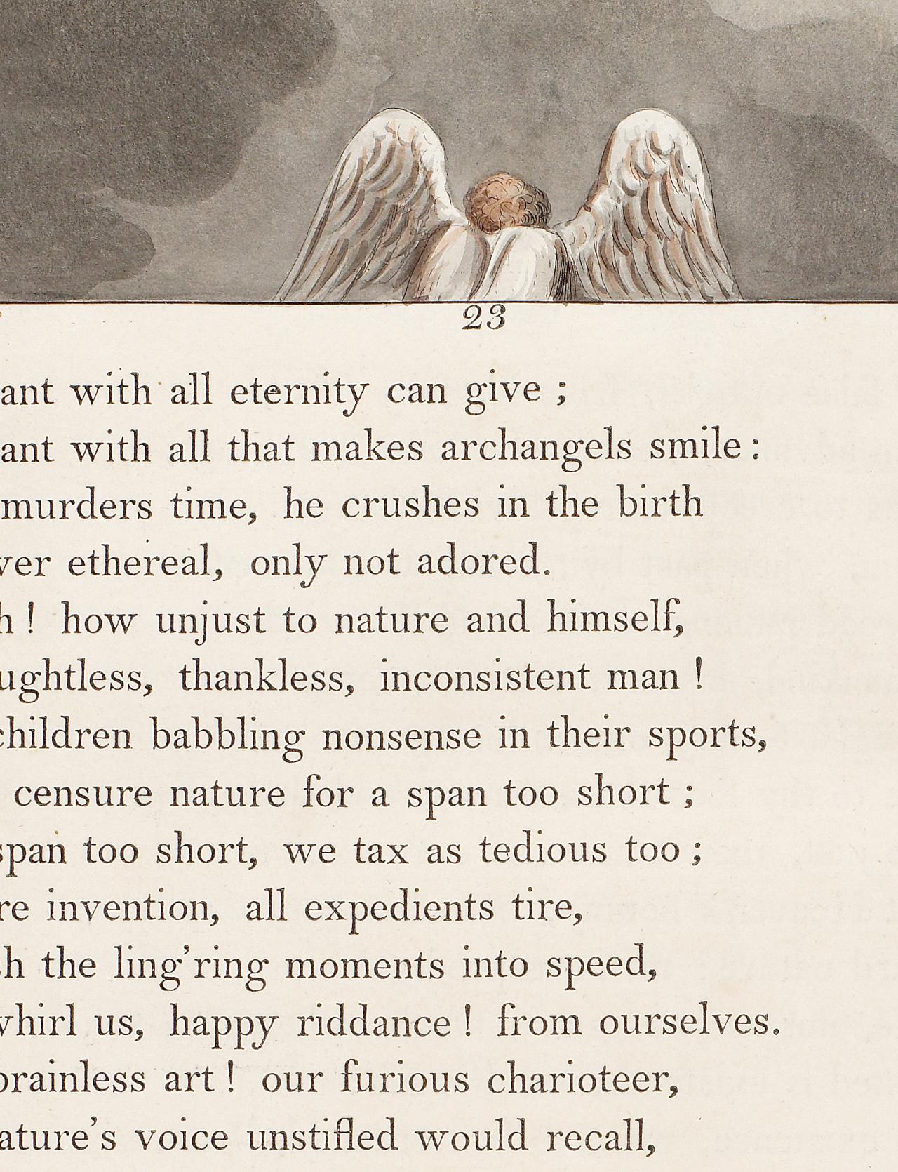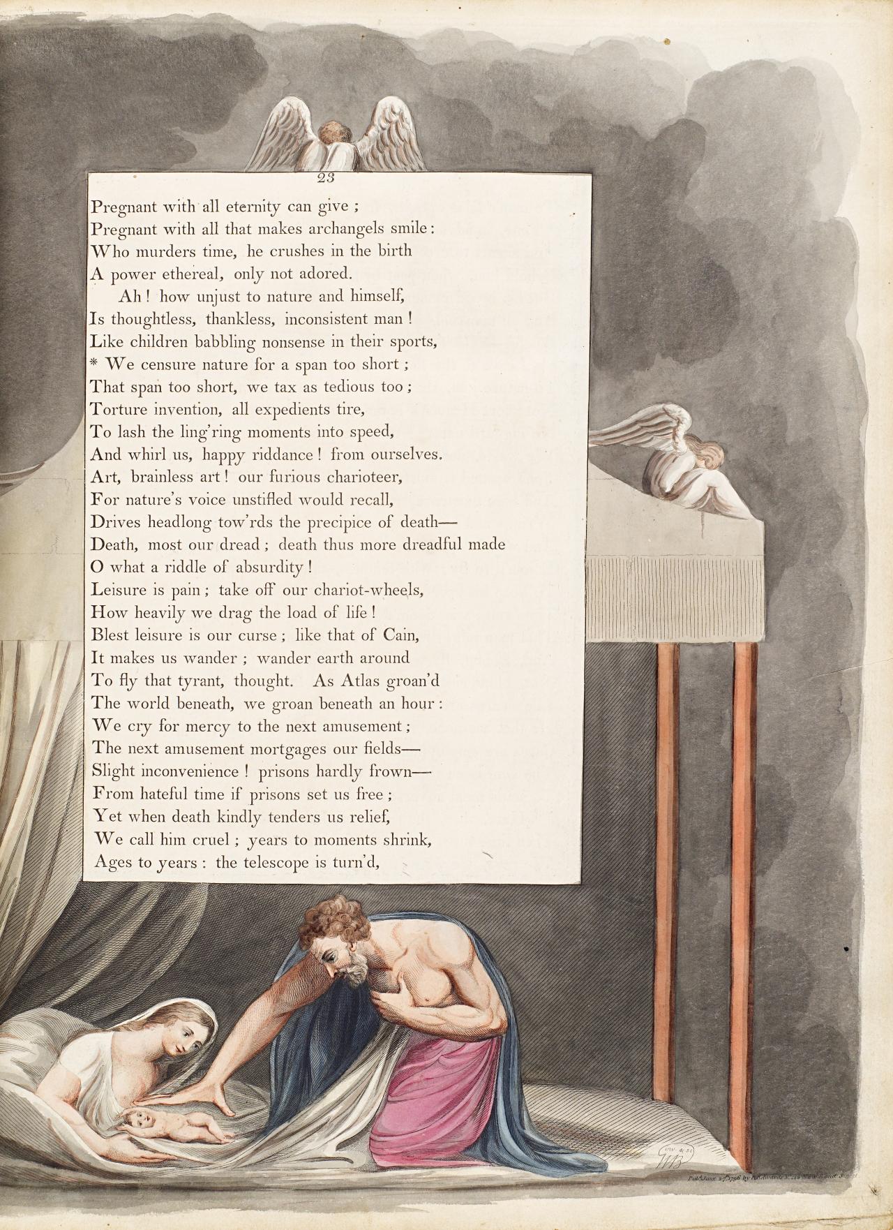 In its capricious playing with one of the figures, the ‘Night the Second’ title-page is comparable only with page 23 (fig. 4), where the central angel was first drawn as an owl before being returned to the form he had in the watercolour (fig. 5). However, no early state of page 23 survives with an imprint date (the date given the second, final, state is also 27 June 1796). It seems likely that an editorial decision was made around July 1796 to exclude (additional) authorial whimsicality from the engraved series. Thus it seems doubtful that there were ever many sheets extant with the third state of the title-page. In any case, Blake was probably glad to take the opportunity to correct the cuff outline and refine details of Time’s wings and certain features of Death’s beard and clothing, besides the perhaps over-prominent furrowing of the ground.