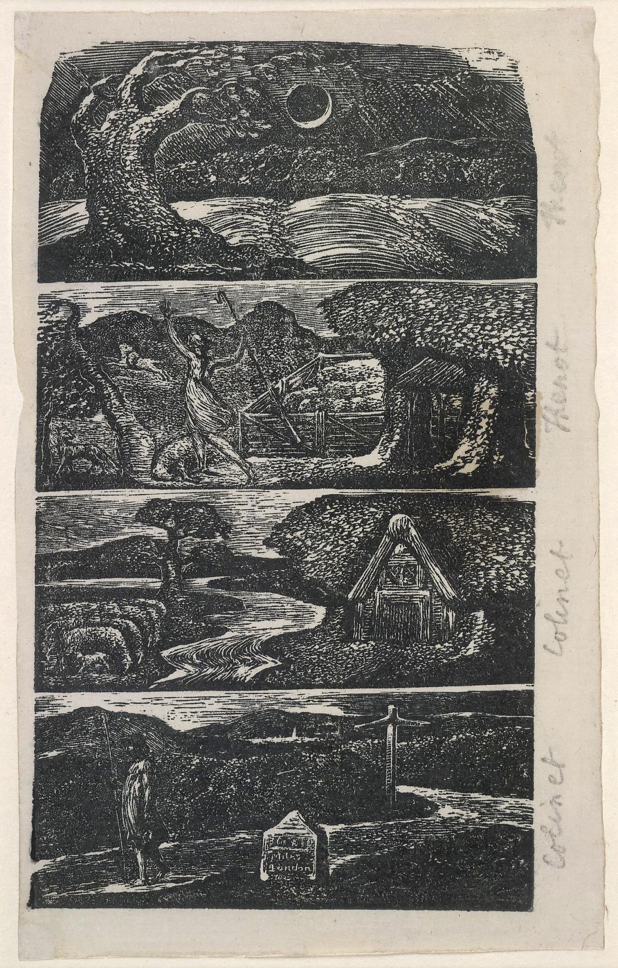 Several years later, he commissioned fellow artist Edward Calvert to print sets of wood engravings from the blocks, a task he completed in 1828.7 Raymond Lister, Edward Calvert, G. Bell and Sons, London, 1962, p. 24. Calvert is best known for his intricate wood engravings of pastoral idylls. These are heavily influenced by Blake’s Virgil designs, which he admired, later writing to his son Samuel: