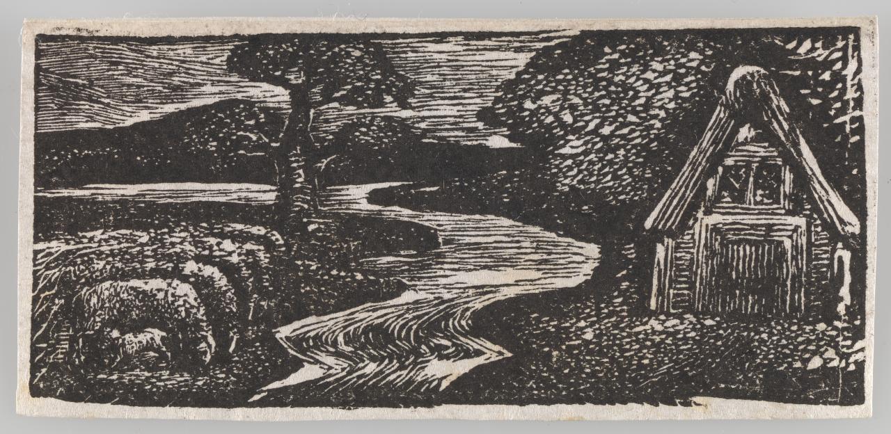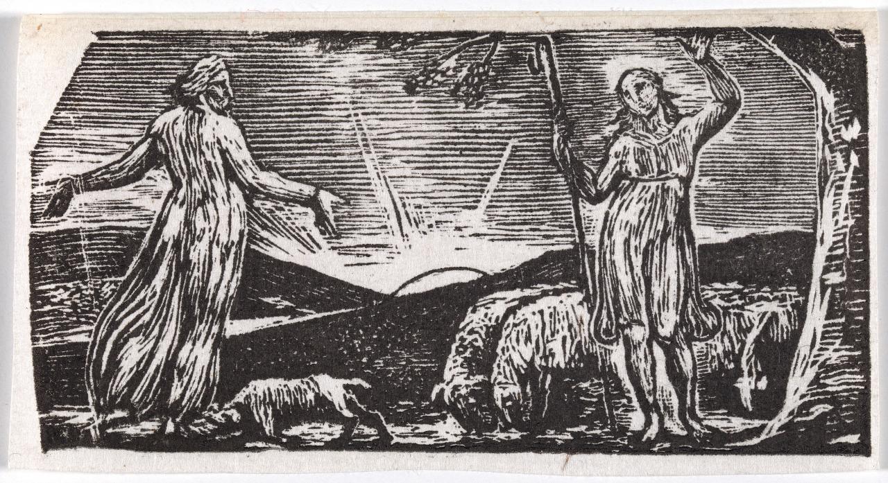 In 1821 Linnell approached Dr Thornton recommending Blake produce seventeen wood engravings for his third edition of The Pastorals of Virgil, a schoolbook designed to teach young boys Latin. Thornton’s vision was to publish ‘a Virgil worthy of the nation – for the benefit of the rising generation – & to inspire them with a love for the arts…’.3 Letter from Dr Robert Thornton to John Linnell, 15 Sep. 1820, in G. E. Bentley, Jr ‘(1969) Blake Records’, Oxford at Clarendon Press, p. 266. Having recently spent time living in the country village of Felpham, Blake must have relished the opportunity to illustrate Ambrose Philip’s imitation of Virgil’s first eclogue, which traced the lives of two shepherds through various rural settings.4 This seventeenth-century cottage in West Sussex is currently undergoing urgent repair to preserve it as a place that celebrates William Blake and inspires future generations of artists across all disciplines. See The Blake Cottage Trust, https://www.blakecottage.org/, accessed 28 February 2025.