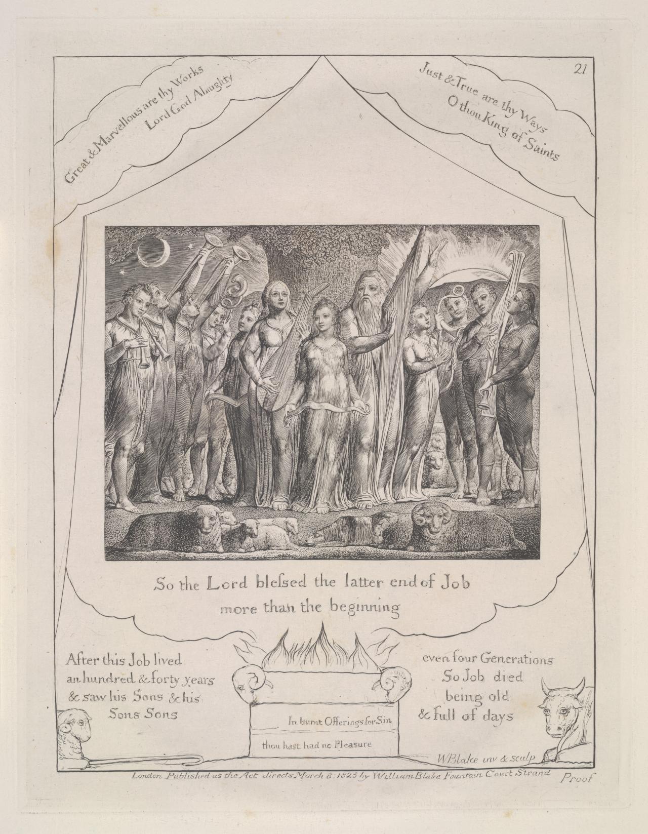 The Book of Job is Blake’s final work in which text and images are integrated into the one design. The engravings give primacy to the images, but the series’ most unusual feature is the way in which the borders are used to carry quotes and adaptations from biblical texts to emphasise points of meaning in the narrative. Blake’s series is a complex, personal interpretation of the Book of Job that has parallels with his own mythology, particularly as expressed in his epic poem Jerusalem (1804–c. 1820). He presents Job as a fallen man who is cut off from the true spiritual dimension of existence and who must endure suffering before achieving redemption. Job’s spiritual awakening is paralleled in Blake’s narrative with his belief in the centrality of the poetic vision, or inspiration. Job’s mistaken focus on the material world and the outward observance of religion is referred to in the opening plate in the family’s conventional, pious poses and the musical instruments (symbols of inspiration) hanging unused on the tree. It is only after suffering torments that Job realises the false nature of his faith and is finally restored to prosperity and a new existence, as seen in the final plate, where he and his family are depicted in joyful activity, singing and making music.